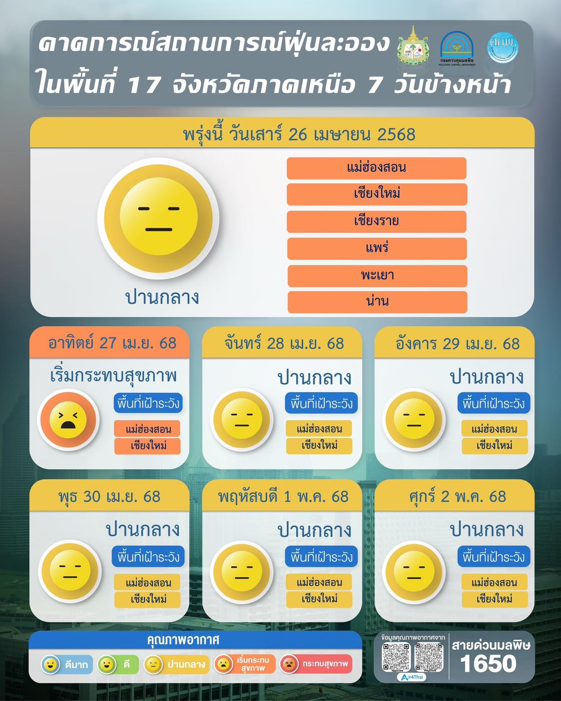 ผลการคาดการณ์สถานการณ์ฝุ่นละออง 7 วันข้างหน้า ระหว่างวันที่ 26 เมษายน – 2 พฤษภาคม 2568