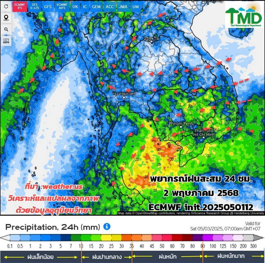 2 พ.ค. 2568 – กรมอุตุนิยมวิทยา อัปเดตผลการพยากรณ์ฝนสะสมรายวัน (ทุกๆ 24 ชม. : (นับตั้งแต่ 07.00 น. ถึง 07.00 น.วันรุ่งขึ้น) และลมที่ระดับ 925hPa (750 ม.) 15 วันล่วงหน้า ระหว่าง 2 – 16 พ.ค. 68 จากศูนย์พยากรณ์อากาศระยะกลางยุโรป (ECMWF) วิเคราะห์ตามผลจากแบบจำลองฯ เฉดสีแดงหมายถึงฝนหนัก สีเขียวหมายถึงฝนเล็กน้อย :