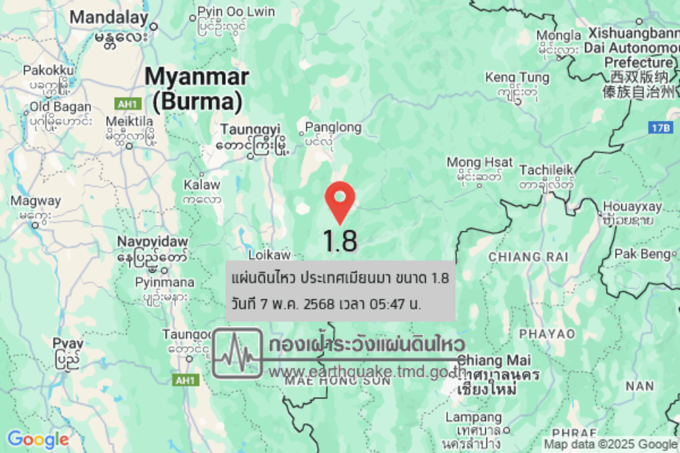 07 พ.ค.2568 - กองเฝ้าระวังแผ่นดินไหว กรมอุตุนิยมวิทยา รายงานการเกิดเหตุแผ่นดินไหวว่า เมื่อเวลา 05.47 น. เกิดเหตุแผ่นดินไหวขนาด 1.8 มีจุดศูนย์กลางที่ประเทศเมียนมา ละติจูด 20.14900 และลองจิจูด 97.90200 ลึกจากผิวดิน 10 กม. ทางทิศตะวันตกเฉียงเหนือของ อ.ปางมะผ้า จ.แม่ฮ่องสอน ประมาณ 78 กม.