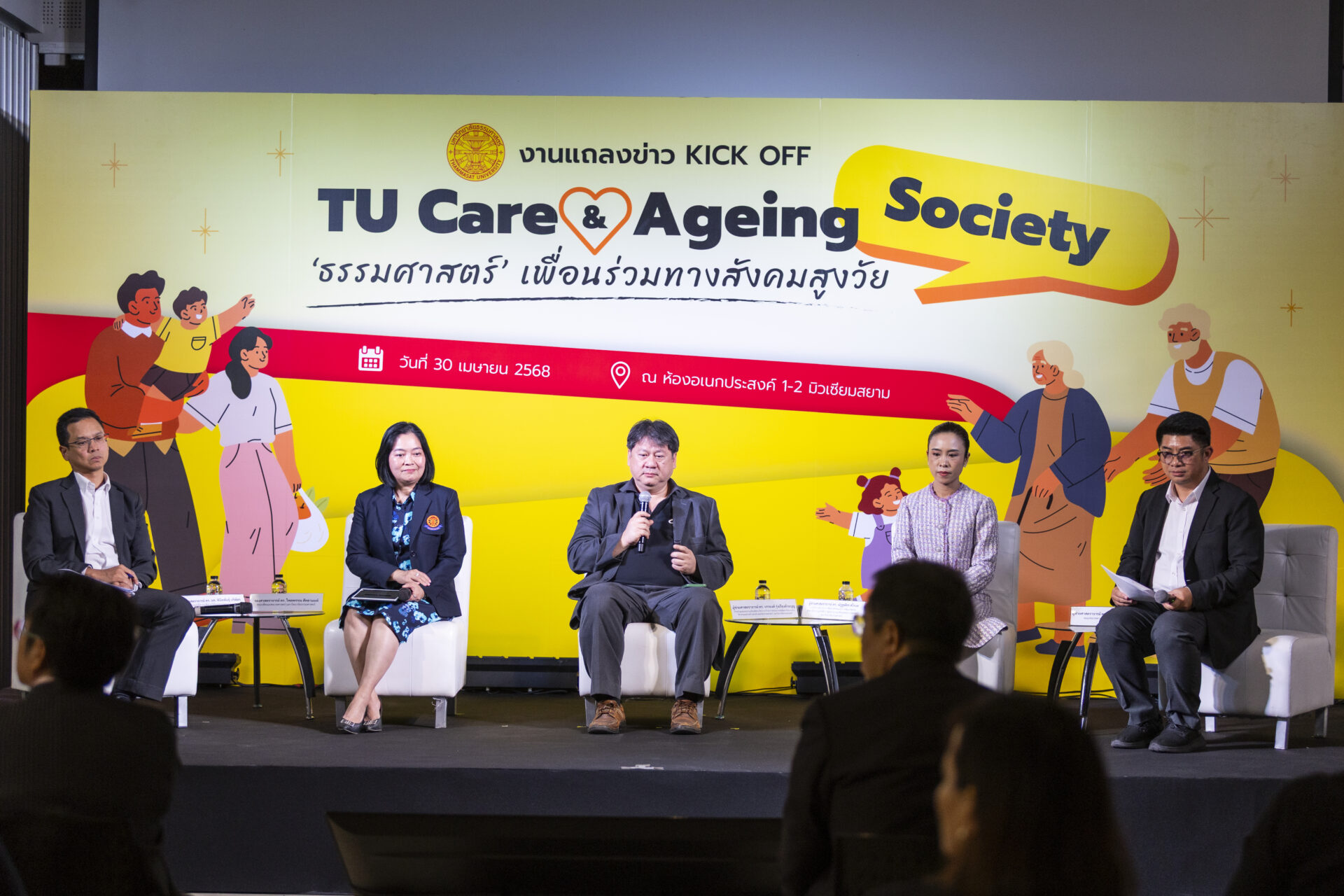 8 พฤษภาคม 2568 - มหาวิทยาลัยธรรมศาสตร์ (มธ.) จัดงานแถลงข่าว KICK OFF โครงการ TU Care & Ageing Society ‘ธรรมศาสตร์’ เพื่อนร่วมทางสังคมสูงวัย เมื่อวันที่ 30 เม.ย. 2568 ประกาศความพร้อมที่จะเป็นส่วนหนึ่งในการดูแลประชาชนและรับใช้สังคมท่ามกลางสถานการณ์ความท้าทายสังคมสูงวัย โดยภายในงานมีการจัดเวทีเสวนา Talk & Share: TU Care & Ageing Society ซึ่งมี 4 นักวิชาการธรรมศาสตร์ร่วมให้มุมมองถึงสถานการณ์ และแนวทางที่มหาวิทยาลัยธรรมศาสตร์ จะเป็นส่วนหนึ่งในการรับมือกับสังคมผู้สูงวัยในประเทศไทย