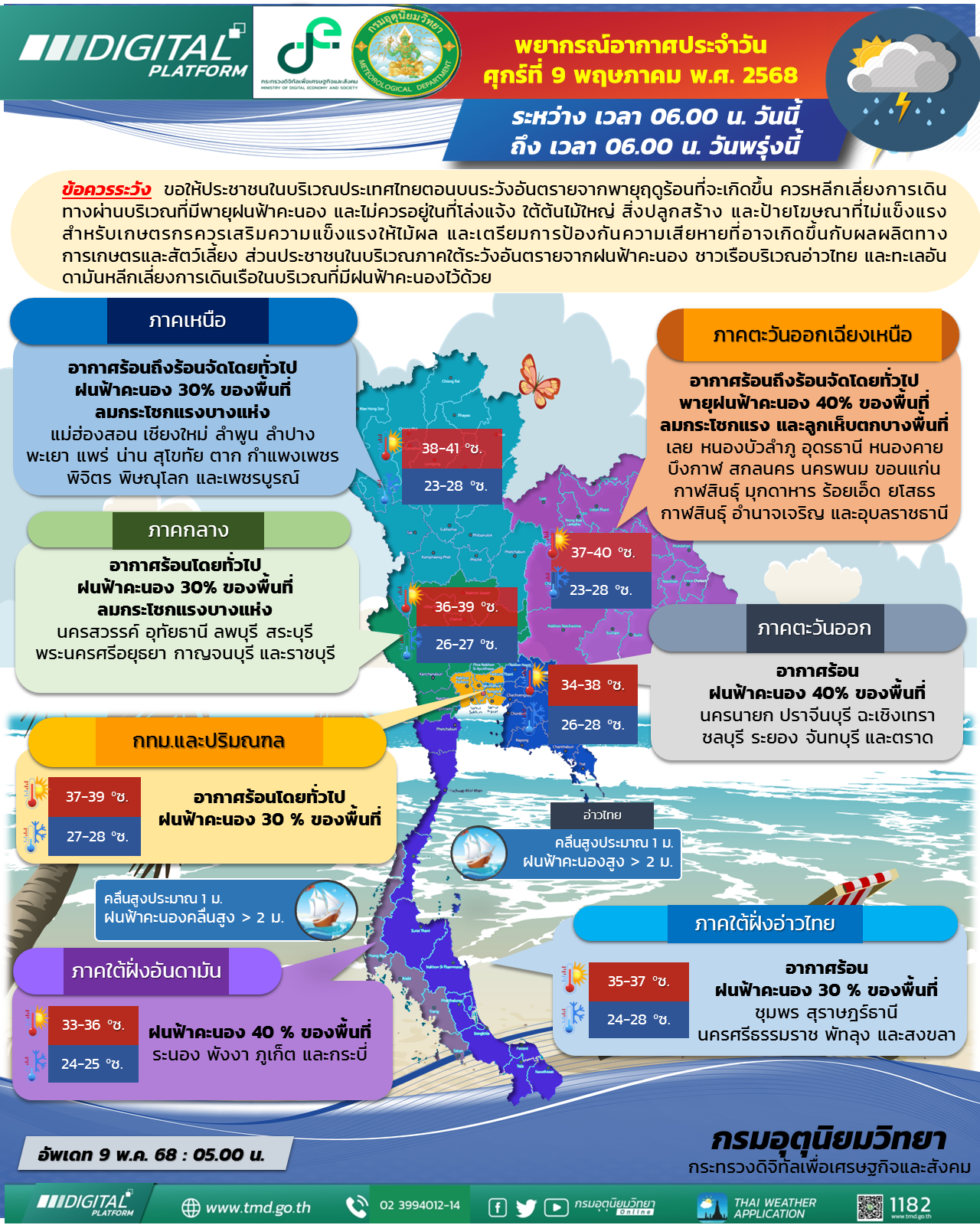 9 พ.ค. 2568 – กรมอุตุนิยมวิทยา พยากรณ์อากาศ 24 ชั่วโมงข้างหน้าว่า ภาคตะวันออกเฉียงเหนือจะมีพายุฤดูร้อนเกิดขึ้น โดยมีลักษณะของพายุฝนฟ้าคะนอง ลมกระโชกแรง และลูกเห็บตกบางแห่ง รวมถึงฟ้าผ่าที่อาจเกิดขึ้นได้บางพื้นที่ ส่วนภาคอื่นๆ จะได้รับผลกระทบในระยะถัดไป ทั้งนี้เนื่องจากบริเวณความกดอากาศสูงกำลังปานกลางจากประเทศจีนจะแผ่ลงมาปกคลุมประเทศเวียดนามและทะเลจีนใต้ในคืนวันนี้ (9 พ.ค. 2568) ส่งผลทำให้มีลมตะวันออกเฉียงใต้และลมใต้พัดนำความชื้นจากอ่าวไทย และทะเลจีนใต้เข้าปกคลุมประเทศไทยตอนบน ในขณะที่ประเทศไทยตอนบนมีอากาศร้อนถึงร้อนจัด ขอให้ประชาชนบริเวณดังกล่าวระวังอันตรายจากพายุฤดูร้อนที่จะเกิดขึ้น ควรหลีกเลี่ยงการเดินทางผ่านบริเวณที่มีพายุฝนฟ้าคะนอง และไม่ควรอยู่ในที่โล่งแจ้ง ใต้ต้นไม้ใหญ่ สิ่งปลูกสร้าง และป้ายโฆษณาที่ไม่แข็งแรง สำหรับเกษตรกรควรเสริมความแข็งแรงให้ไม้ผล และเตรียมการป้องกันความเสียหายที่อาจเกิดขึ้นกับผลผลิตทางการเกษตรและสัตว์เลี้ยง