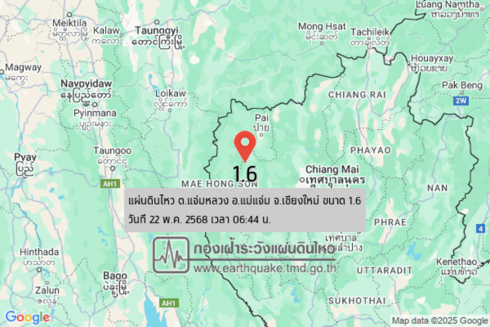 22 พ.ค.2568 – กองเฝ้าระวังแผ่นดินไหว กรมอุตุนิยมวิทยา ได้แจ้งแผ่นดินไหวว่า เมื่อเวลา 23.55 น.ตามเวลามาตรฐานสากล หรือตรงกับเวลา 06.44 น.ตามเวลาในประเทศไทย ได้เกิดแผ่นดินไหวขนาด 1.6 มีศูนย์กลางอยู่ที่ 18.995°N , 98.222°E อยู่ที่ ต.แจ่มหลวง อ.แม่แจ่ม จ.เชียงใหม่ ความลึก 2 กิโลเมตร