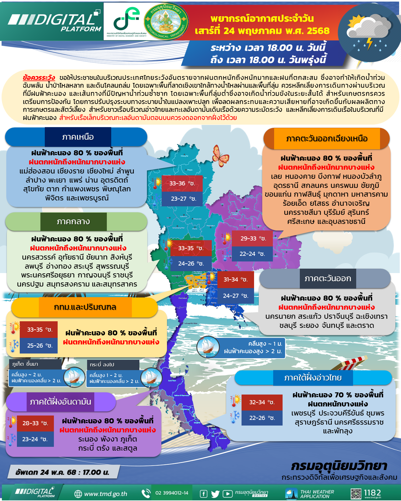 25 พฤษภาคม 2568 กรมอุตุนิยมวิทยา พยากรณ์อากาศ 24 ชั่วโมงข้างหน้า บริเวณภาคเหนือ ภาคตะวันออกเฉียงเหนือ ภาคกลาง รวมทั้งกรุงเทพมหานครและปริมณฑล ภาคตะวันออก และภาคใต้ฝั่งตะวันตกมีฝนตกหนักถึงหนักมาก ขอให้ประชาชนในบริเวณประเทศไทยระวังอันตรายจากฝนตกหนักถึงหนักมากและฝนที่ตกสะสม ซึ่งอาจทำให้เกิดน้ำท่วมฉับพลัน น้ำป่าไหลหลาก และดินโคลนถล่ม โดยเฉพาะพื้นที่ลาดเชิงเขาใกล้ทางน้ำไหลผ่านและพื้นที่ลุ่ม ควรหลีกเลี่ยงการเดินทางผ่านบริเวณที่มีฝนฟ้าคะนอง และเส้นทางที่มีปัญหาน้ำท่วมซ้ำซาก โดยเฉพาะพื้นที่ลุ่มต่ำซึ่งอาจเกิดน้ำท่วมขังในระยะสั้นได้ สำหรับเกษตรกรควรเตรียมการป้องกัน โดยการปรับปรุงระบบทางระบายน้ำในแปลงเพาะปลูก เพื่อลดผลกระทบและความเสียหายที่อาจเกิดขึ้นกับผลผลิตทางการเกษตรและสัตว์เลี้ยง เนื่องจากร่องมรสุมพาดผ่านประเทศไทยตอนบน และภาคใต้ตอนบน ประกอบกับมรสุมตะวันตกเฉียงใต้ที่พัดปกคลุมทะเลอันดามัน ประเทศไทยและอ่าวไทยมีกำลังปานกลาง
