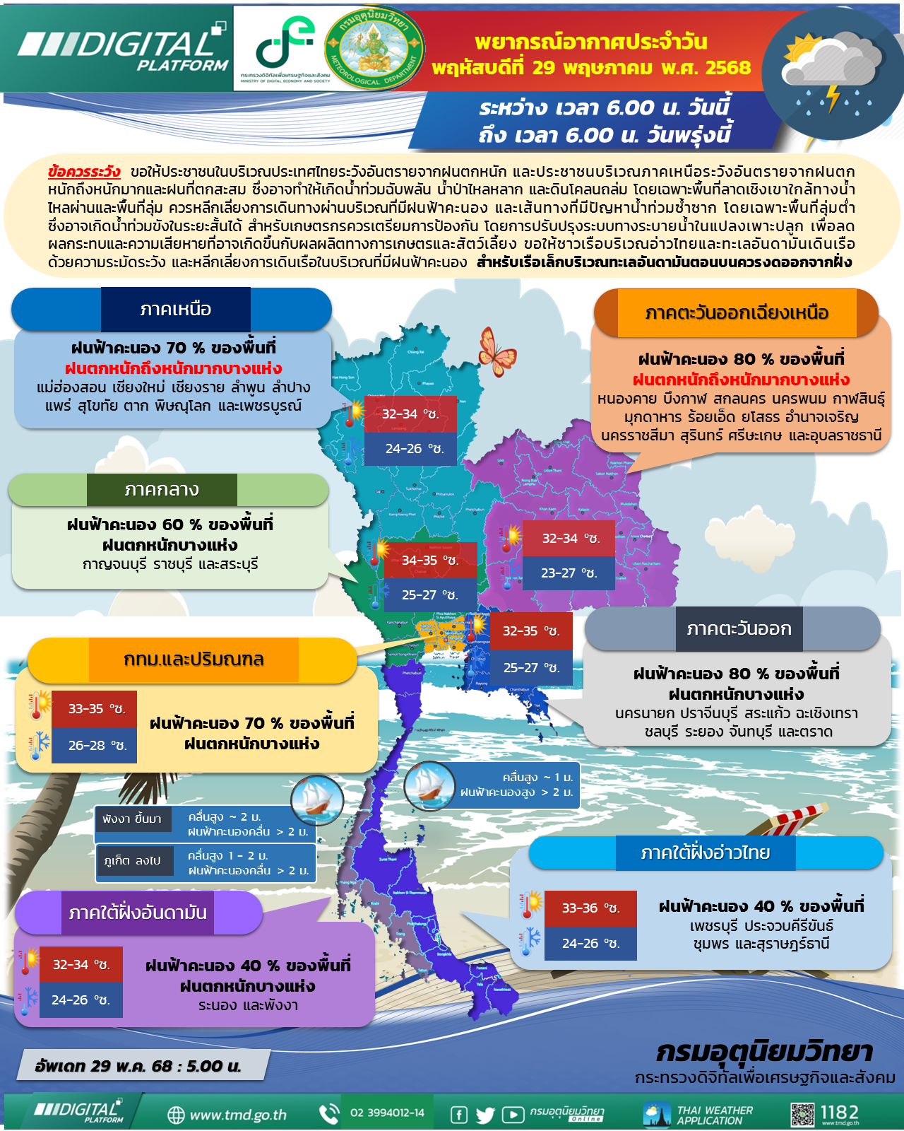 ภาคใต้(ฝั่งตะวันตก) มีฝนฟ้าคะนอง ร้อยละ 40 ของพื้นที่ ส่วนมากบริเวณจังหวัดระนอง และพังงา อุณหภูมิต่ำสุด 24-26 องศาเซลเซียส อุณหภูมิสูงสุด 32-34 องศาเซลเซียส ตั้งแต่จังหวัดพังงา ขึ้นมา: ลมตะวันตกเฉียงใต้ ความเร็ว 20-35 กม./ชม. ทะเลมีคลื่นสูงประมาณ 2 เมตร บริเวณที่มีฝนฟ้าคะนองคลื่นสูงมากกว่า 2 เมตร ตั้งแต่จังหวัดภูเก็ต ลงไป: ลมตะวันตกเฉียงใต้ ความเร็ว 15-35 กม./ชม. ทะเลมีคลื่นสูง 1-2 เมตร บริเวณที่มีฝนฟ้าคะนองคลื่นสูงมากกว่า 2 เมตร