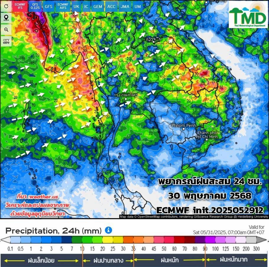 30 พ.ค. 2568 – กรมอุตุนิยมวิทยา อัปเดตผลการพยากรณ์ฝนสะสมรายวัน (ทุกๆ 24 ชม. : (นับตั้งแต่ 07.00 น. ถึง 07.00 น.วันรุ่งขึ้น) และลมที่ระดับ 925hPa (750 ม.) 15 วันล่วงหน้า ระหว่าง 30 พ.ค. – 13 มิ.ย. 68 init. 2025052912 จากศูนย์พยากรณ์อากาศระยะกลางยุโรป (ECMWF) วิเคราะห์ตามผลจากแบบจำลองฯ เฉดสีแดงหมายถึงฝนหนัก สีเขียวหมายถึงฝนเล็กน้อย :