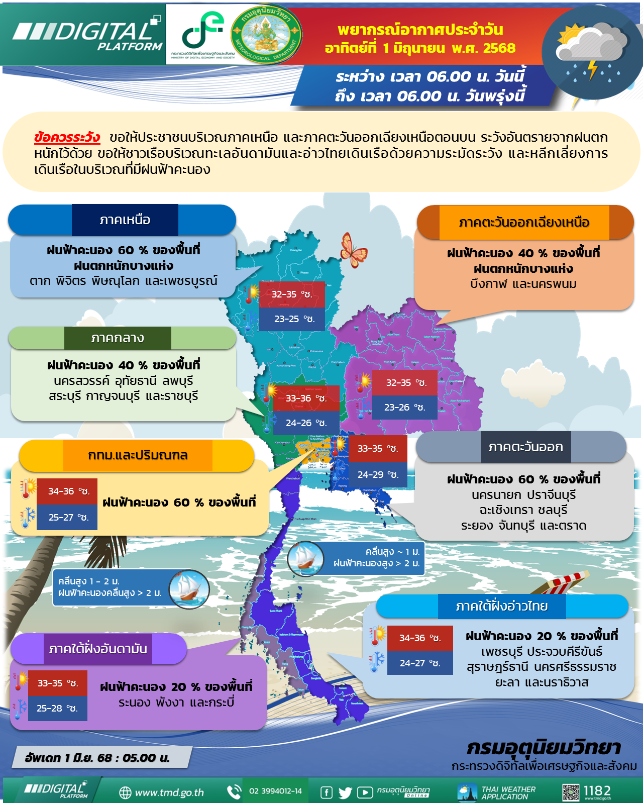 1 มิ.ย. 2568 – กรมอุตุนิยมวิทยา รายงานลักษณะอากาศทั่วไปของวันนี้ พบว่า ประเทศไทยตอนบนยังคงมีฝนตกหนักบางแห่งในภาคเหนือ และภาคตะวันออกเฉียงเหนือตอนบน ส่วนภาคใต้มีฝนฟ้าคะนองบางพื้นที่ ขอให้ประชาชนในบริเวณดังกล่าวระวังอันตรายจากฝนตกหนักไว้ด้วย เนื่องจากมรสุมตะวันตกเฉียงใต้กำลังปานกลางพัดปกคลุมทะเลอันดามัน ประเทศไทย และอ่าวไทย