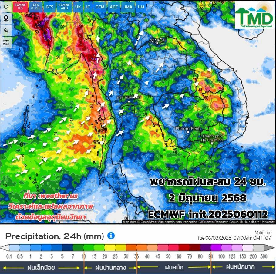2 มิ.ย. 2568 – กรมอุตุนิยมวิทยา อัปเดตผลการพยากรณ์ฝนสะสมรายวัน (ทุกๆ 24 ชม. : (นับตั้งแต่ 07.00 น. ถึง 07.00 น.วันรุ่งขึ้น) และลมที่ระดับ 925hPa (750 ม.) 15 วันล่วงหน้า ระหว่าง 2 – 16 มิ.ย. 68 init. 2025060112 จากศูนย์พยากรณ์อากาศระยะกลางยุโรป (ECMWF) วิเคราะห์ตามผลจากแบบจำลองฯ เฉดสีแดงหมายถึงฝนหนัก สีเขียวหมายถึงฝนเล็กน้อย :