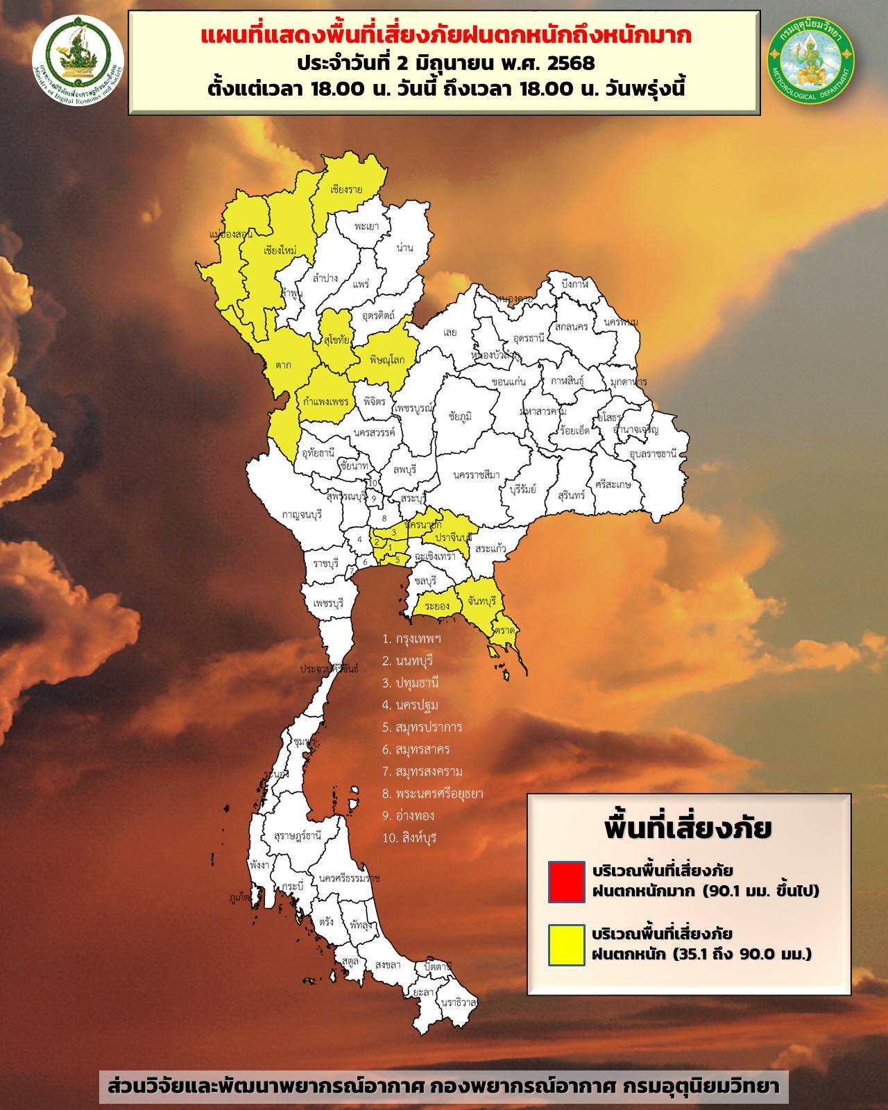 2 มิถุนายน 2568 - กรมอุตุนิยมวิทยา พยากรณ์อากาศ 24 ชั่วโมงข้างหน้า ประเทศไทยตอนบนยังคงมีฝนตกหนักบางแห่ง ส่วนภาคใต้มีฝนฟ้าคะนองบางพื้นที่ ขอให้ประชาชนในบริเวณดังกล่าวระวังอันตรายจากฝนตกหนักไว้ด้วย เนื่องจากมรสุมตะวันตกเฉียงใต้กำลังปานกลางพัดปกคลุมทะเลอันดามัน ประเทศไทย และอ่าวไทย ประกอบกับมีหย่อมความกดอากาศต่ำปกคลุมบริเวณประเทศเวียดนามตอนบน