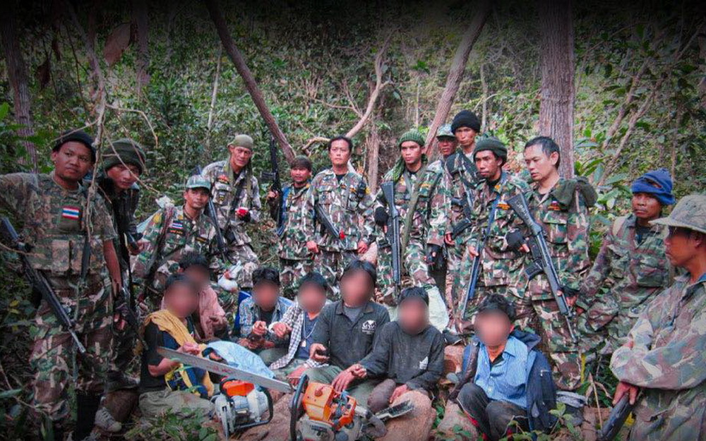 ภาพดังกล่าวเผยให้เห็นเจ้าหน้าที่อุทยานฯ ยืนล้อมจับตัวชายขาวเขมร 7 คน ที่ลักลอบเข้ามาตัดไม้ในพื้นที่ของประเทศไทย