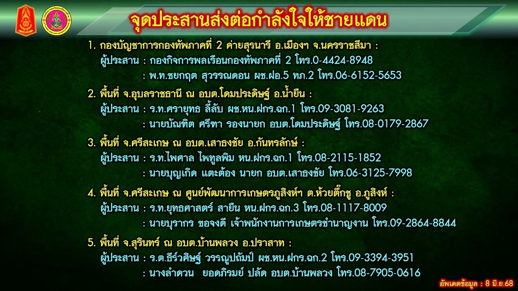 2. พื้นที่ จ.อุบลราชธานี ณ อบต.โดมประดิษฐ์ อ.น้ำยืน ผู้ประสาน ร.ท.ศรายุทธ ลี้ลับ ผช.ทน.ฝกร.ฉก.1 โทร.09-3081-9263 นายบัณฑิต ศรีฑา รองนายก อบต.โดมประดิษฐ์ โทร.08-0179-2867