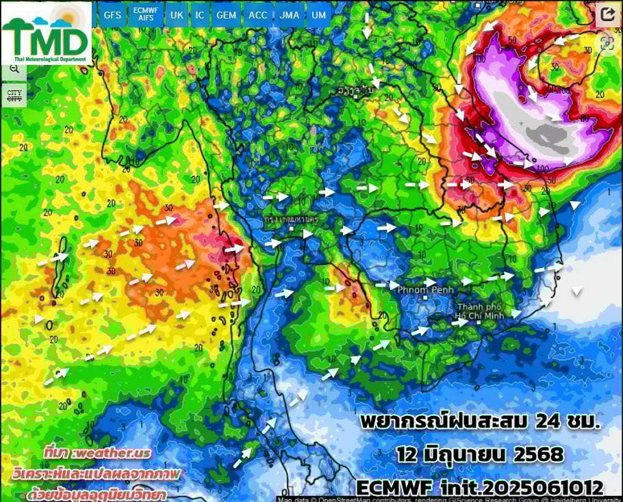ภาพกราฟิกจากกรมอุตุนิยมวิทยา พยากรณ์ฝนตกในวันที่ 11-12 มิ.ย. จะมีฝนเพิ่มขึ้น