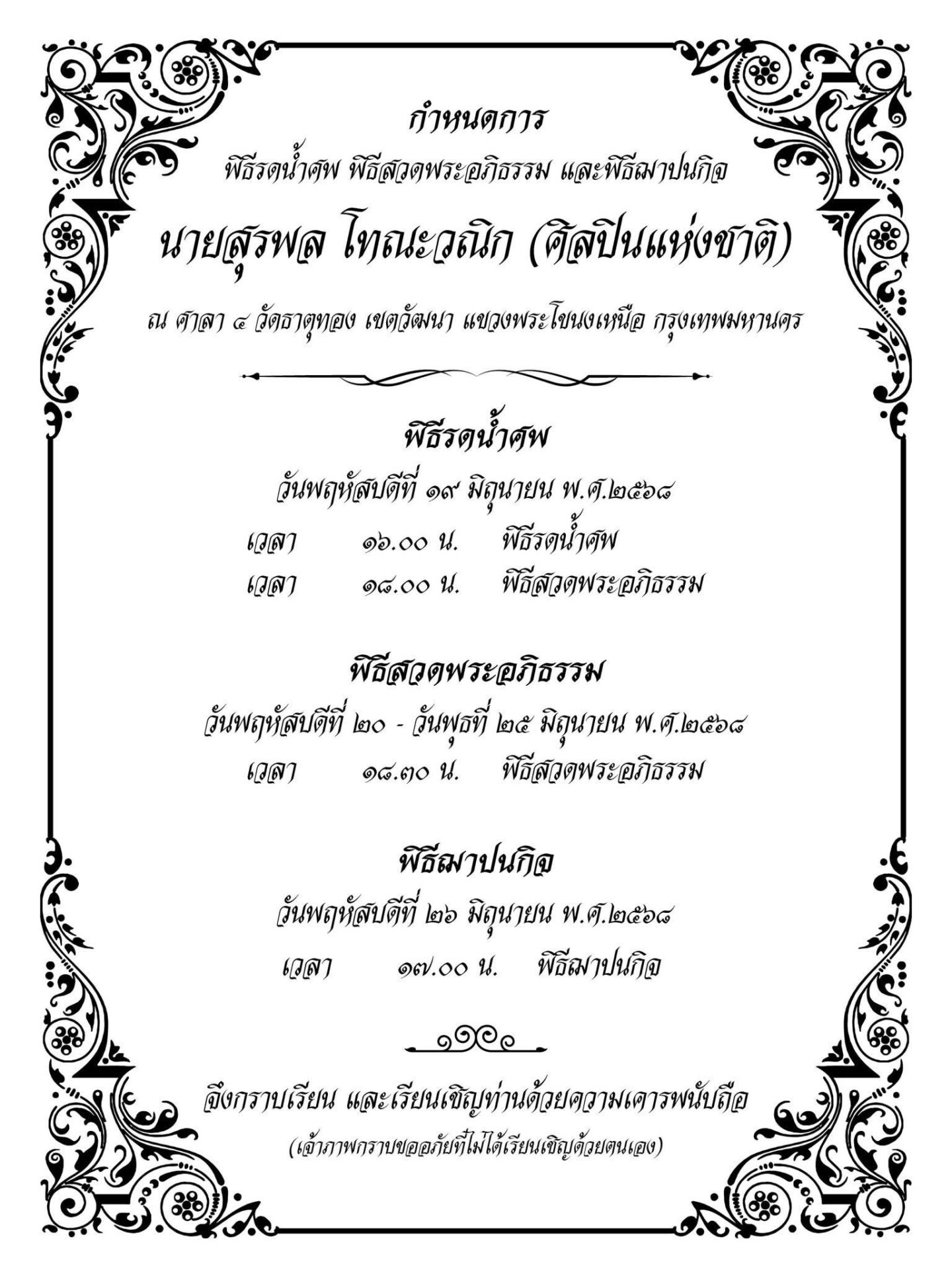 19 มิถุนายน 2568 - เพจเฟซบุ๊ก สุรพลน้อย โทณะวณิก แจ้งข่าวการเสียชีวิตของ สุรพล โทณะวณิก ศิลปินแห่งชาติ สาขาศิลปะการแสดง (เพลงไทยสากล-ประพันธ์) อายุ 98 ปี ซึ่งจากไปอย่างสงบในช่วงเวลา 6 โมงเช้าที่ผ่านมา ที่โรงพยาบาลแห่งหนึ่งในกรุงเทพฯ โดยทางครอบครัวกำหนดจัดพิธีรดน้ำศพในวันที่ 19 มิ.ย. เวลา 16.00 น. และสวดพระอภิธรรม 19-25 มิ.ย. เวลา 18.30 น. ณ ศาลา 4 วัดธาตุทอง เขตวัฒนา กรุงเทพฯ ส่วนพิธีฌาปนกิจ 26 มิ.ย.