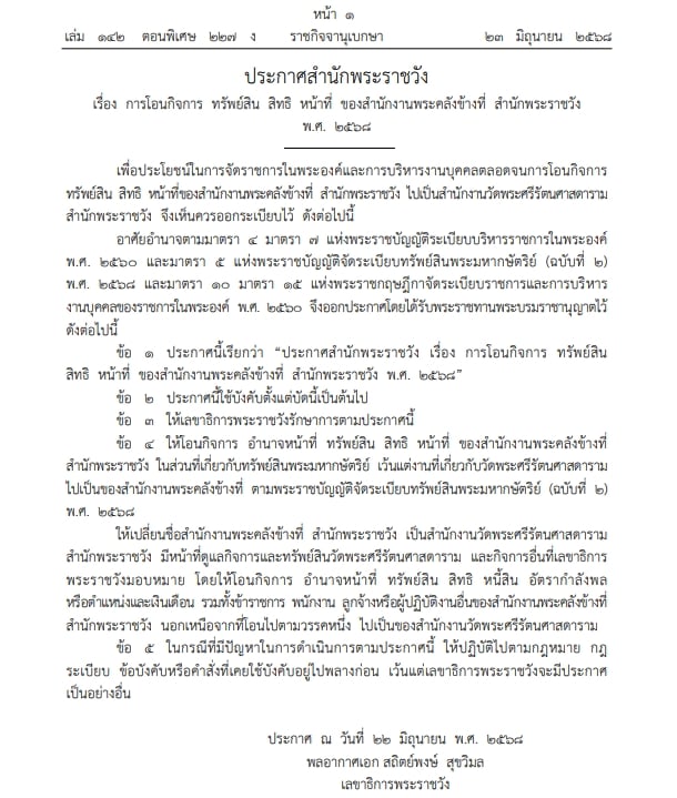 24 มิถุนายน 2568 - เว็บไซต์ราชกิจจานุเบกษา เผยแพร่ประกาศสำนักพระราชวัง เรื่อง การโอนกิจการ ทรัพย์สิน สิทธิ หน้าที่ ของสำนักงานพระคลังข้างที่ สำนักพระราชวัง พ.ศ. ๒๕๖๘