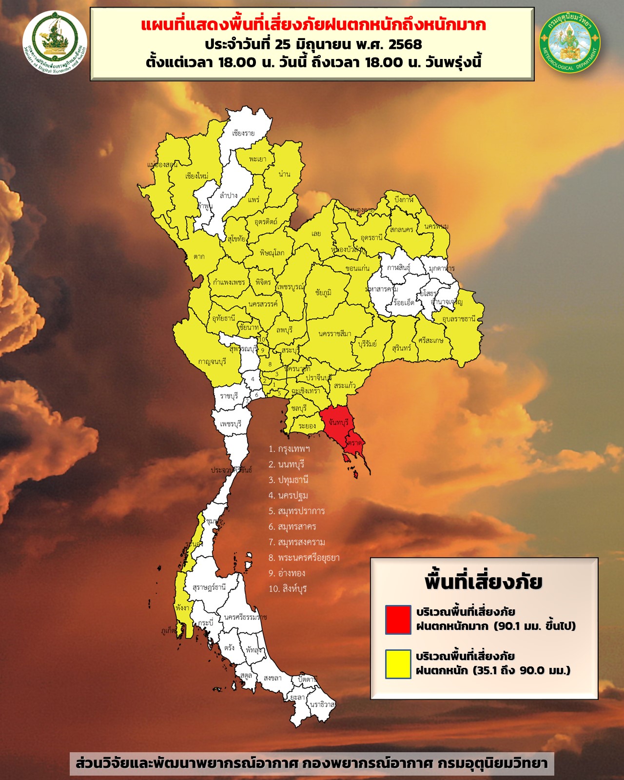25 มิถุนายน 2568 - เมื่อเวลา 17.00 น. กรมอุตุนิยมวิทยา พยากรณ์อากาศ 24 ชั่วโมงข้างหน้า ประเทศไทยตอนบนมีการกระจายของฝนฟ้าคะนองเพิ่มขึ้นและมีฝนตกหนักบางแห่ง โดยมีฝนตกหนักมากบางพื้นที่ในภาคตะวันออก ขอให้ประชาชนบริเวณดังกล่าวระวังอันตรายจากฝนตกหนักถึงหนักมากและฝนที่ตกสะสม ซึ่งอาจทำให้เกิดน้ำท่วมฉับพลัน น้ำป่าไหลหลากและดินโคลนถล่ม โดยเฉพาะพื้นที่ลาดเชิงเขาใกล้ทางน้ำไหลผ่านและพื้นที่ลุ่ม
