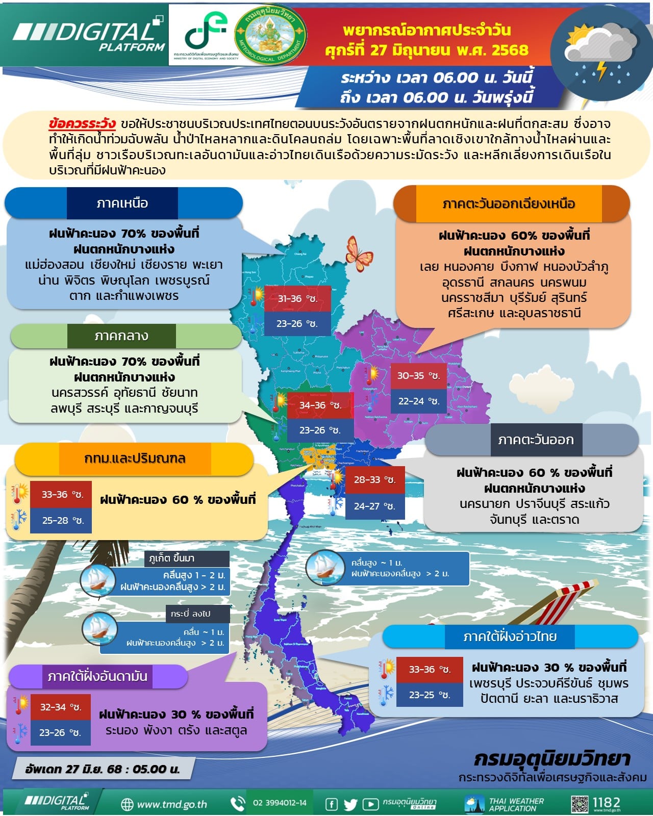 27มิ.ย.2568 - กรมอุตุนิยมวิทยา ออกประกาศพยากรณ์อากาศ 24 ชั่วโมงข้างหน้า ประเทศไทยตอนบนมีฝนตกหนักบางแห่ง ส่วนภาคใต้มีฝนฟ้าคะนองบางพื้นที่ ขอให้ประชาชนบริเวณประเทศไทยตอนบนระวังอันตรายจากฝนตกหนักและฝนที่ตกสะสม ซึ่งอาจทำให้เกิดน้ำท่วมฉับพลัน น้ำป่าไหลหลากและดินโคลนถล่ม โดยเฉพาะพื้นที่ลาดเชิงเขาใกล้ทางน้ำไหลผ่านและพื้นที่ลุ่ม ทั้งนี้เนื่องจากร่องมรสุมพาดผ่านภาคเหนือตอนบนและประเทศลาวตอนบน เข้าสู่หย่อมความกดอากาศต่ำบริเวณประเทศเวียดนามตอนบน ประกอบกับมรสุมตะวันตกเฉียงใต้ที่พัดปกคลุมทะเลอันดามัน ประเทศไทย และอ่าวไทยมีกำลังปานกลาง