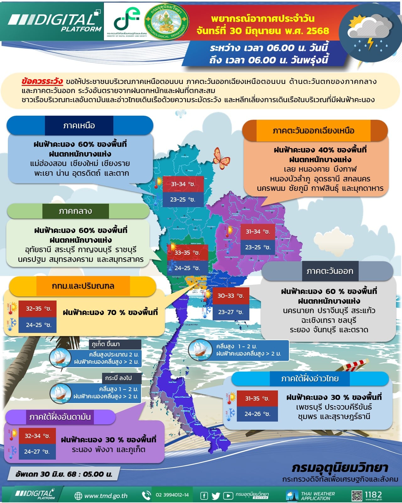 30 มิ.ย. 2568 – กรมอุตุนิยมวิทยา พยากรณ์อากาศ 24 ชั่วโมงข้างหน้าว่า บริเวณภาคเหนือตอนบน ภาคตะวันออกเฉียงเหนือตอนบน ด้านตะวันตกของภาคกลาง และภาคตะวันออก ยังคงมีฝนตกหนักบางแห่ง ขอให้ประชาชนบริเวณดังกล่าวระวังอันตรายจากฝนตกหนักและฝนที่ตกสะสม ส่วนภาคใต้มีฝนฟ้าคะนองบางพื้นที่ ทั้งนี้เนื่องจากมรสุมตะวันตกเฉียงใต้ที่พัดปกคลุมทะเลอันดามัน ประเทศไทย และอ่าวไทยมีกำลังปานกลาง ประกอบกับมีหย่อมความกดอากาศต่ำปกคลุมบริเวณประเทศเวียดนามตอนบน