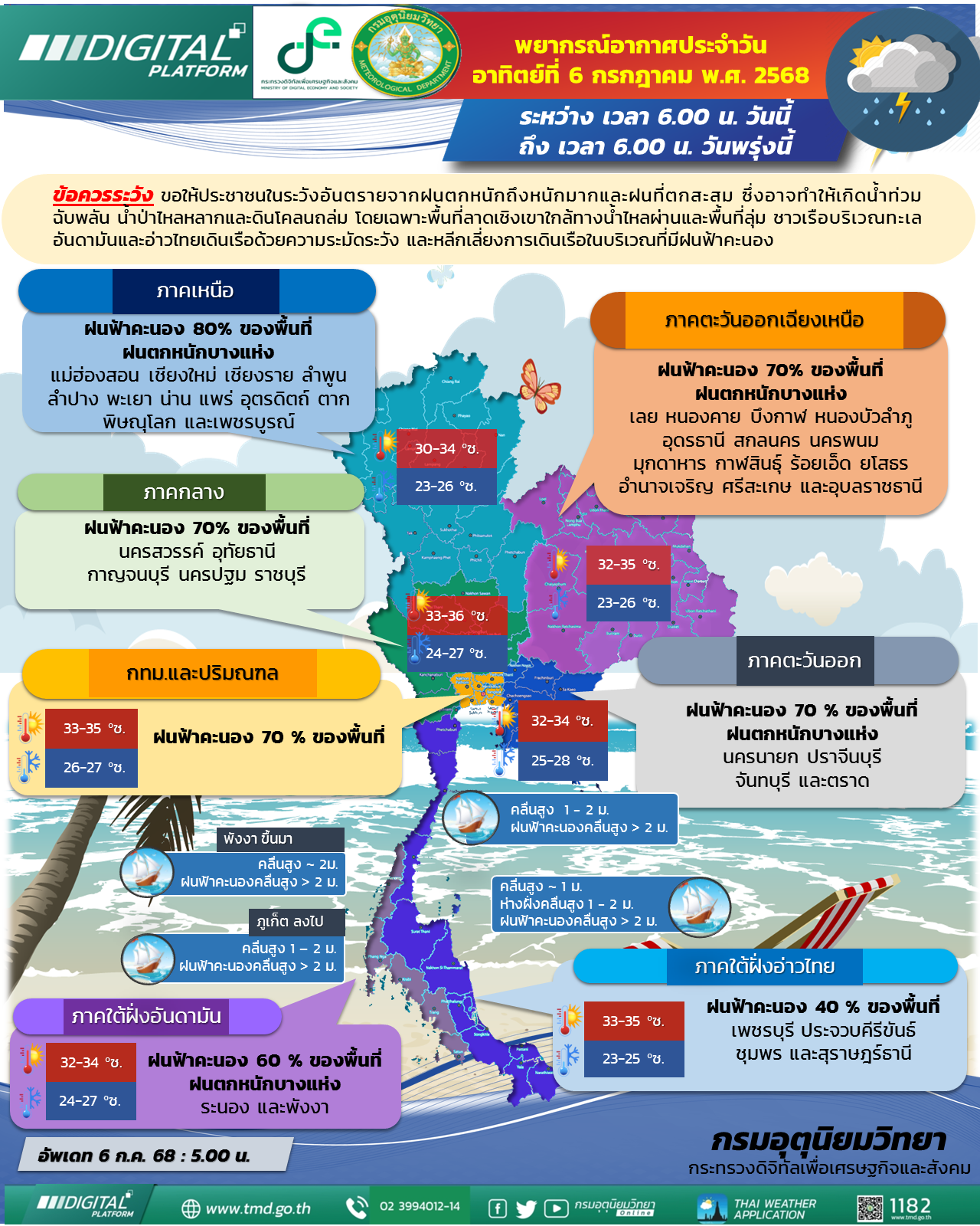 6 ก.ค. 68 – กรมอุตุนิยมวิทยา รายงานสภาพอากาศ พยากรณ์อากาศ 24 ชั่วโมงข้างหน้า ภาคเหนือ ภาคตะวันออกเฉียงเหนือ ภาคตะวันออก และภาคใต้มีฝนตกหนักบางแห่ง ขอให้ประชาชนในบริเวณจังหวัดภาคเหนือ ภาคตะวันออกเฉียงเหนือ ภาคตะวันออก และภาคใต้ ระวังอันตรายจากฝนตกหนักและฝนที่ตกสะสม ซึ่งอาจทำให้เกิดน้ำท่วมฉับพลันน้ำป่าไหลหลาก โดยเฉพาะพื้นที่ลาดเชิงเขาใกล้ทางน้ำไหลผ่านและพื้นที่ลุ่ม ทั้งนี้เนื่องจากมีหย่อมความกดอากาศต่ำปกคลุมบริเวณประเทศเมียนมาตอนบนและลาวตอนบน ประกอบกับมรสุมตะวันตกเฉียงใต้กำลังปานกลางยังคงพัดปกคลุมทะเลอันดามัน ประเทศไทย และอ่าวไทย