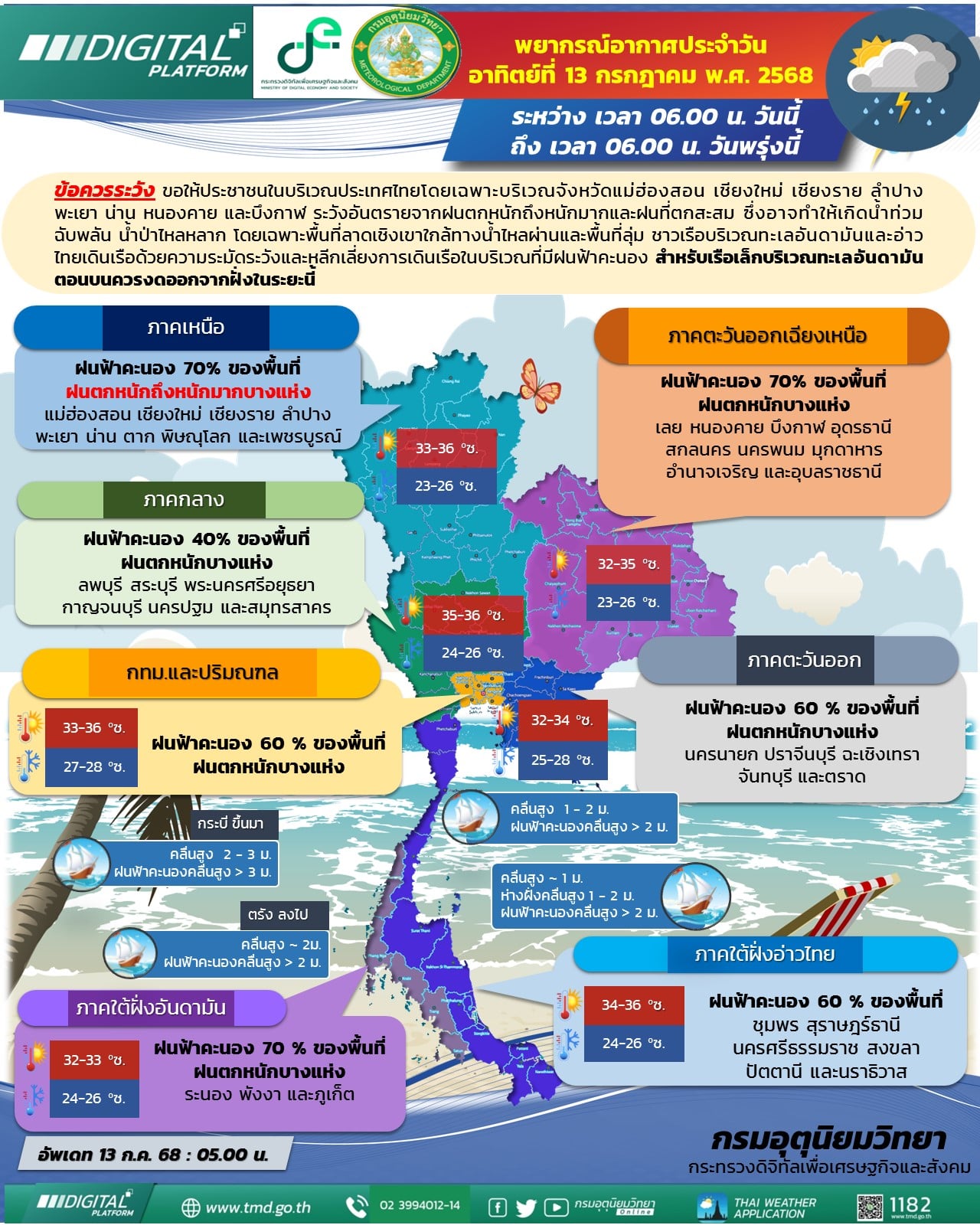 13 ก.ค. 68 กรมอุตุนิยมวิทยา รายงานสภาพอากาศ 24 ชั่วโมงข้างหน้า ภาคเหนือมีฝนตกหนักถึงหนักมากบางพื้นที่ ส่วนภาคตะวันออกเฉียงเหนือ ภาคกลาง ภาคตะวันออก และภาคใต้มีฝนตกหนักบางแห่ง ขอให้ประชาชนในบริเวณดังกล่าว โดยเฉพาะบริเวณจังหวัดแม่ฮ่องสอน เชียงใหม่ เชียงราย ลำปาง พะเยา น่าน หนองคาย และบึงกาฬ ระวังอันตรายจากฝนตกหนักถึงหนักมากและฝนที่ตกสะสม ซึ่งอาจทำให้เกิดน้ำท่วมฉับพลัน น้ำป่าไหลหลาก โดยเฉพาะพื้นที่ลาดเชิงเขาใกล้ทางน้ำไหลผ่านและพื้นที่ลุ่ม ทั้งนี้เนื่องจากมีร่องมรสุมพาดผ่านภาคเหนือตอนบน ภาคตะวันออกเฉียงเหนือตอนบน ประเทศลาว และประเทศเวียดนามตอนบนในขณะที่มีหย่อมความกดอากาศต่ำปกคลุมบริเวณภาคเหนือตอนบน ประกอบกับมรสุมตะวันตกเฉียงใต้กำลังค่อนข้างแรงพัดปกคลุมทะเลอันดามัน ประเทศไทย และอ่าวไทย