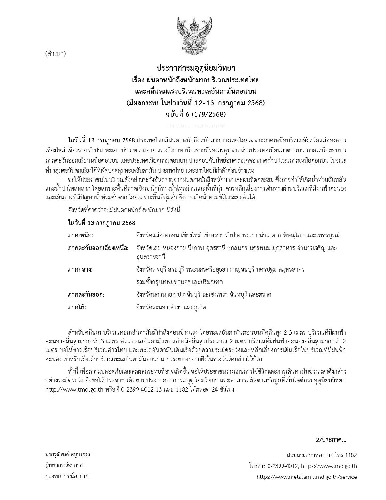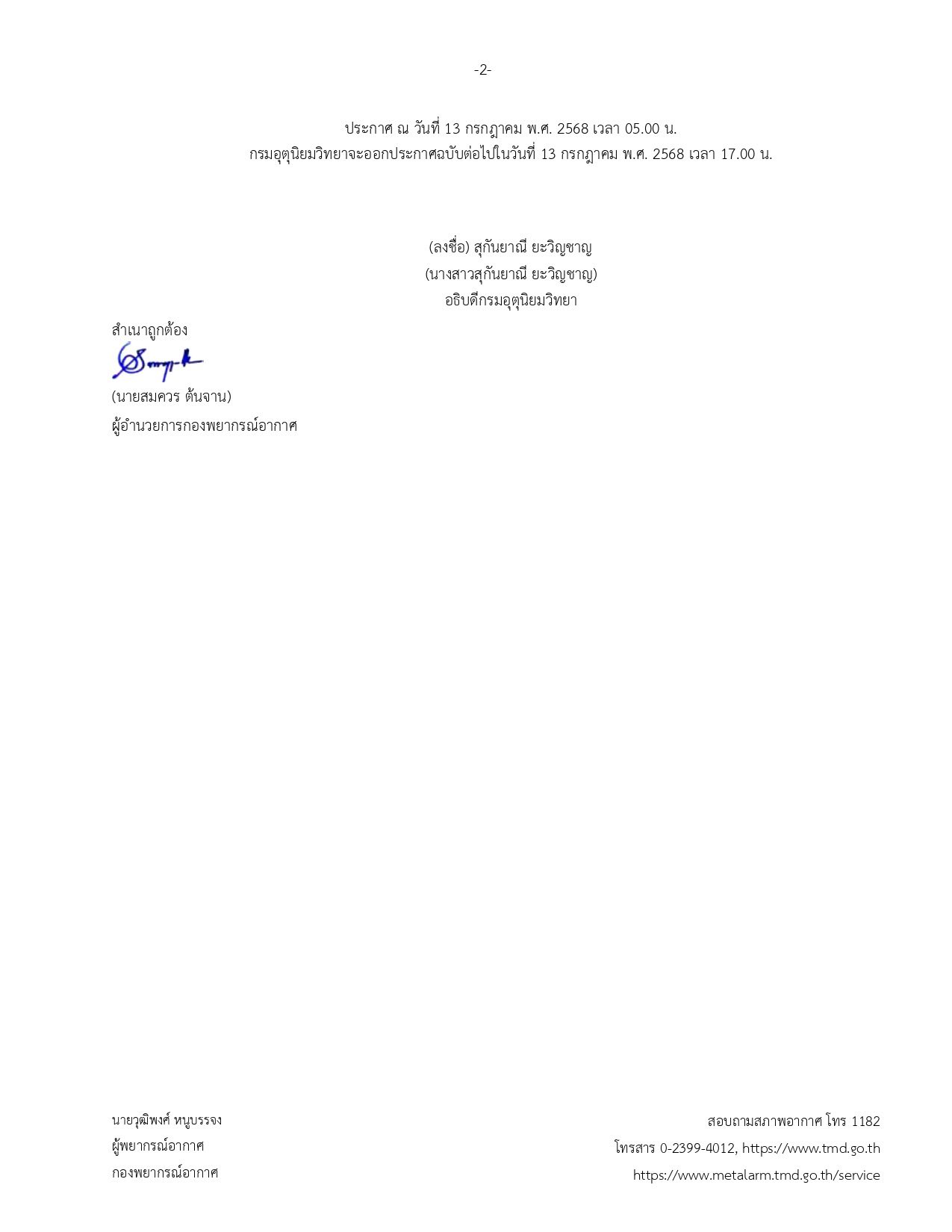 ทั้งนี้ เพื่อความปลอดภัยและลดผลกระทบที่อาจเกิดขึ้น ขอให้ประชาชนวางแผนการใช้ชีวิตและการเดินทางในช่วงเวลาดังกล่าวอย่างระมัดระวัง จึงขอให้ประชาชนติดตามประกาศจากกรมอุตุนิยมวิทยา และสามารถติดตามข้อมูลที่เว็บไซต์กรมอุตุนิยมวิทยา http://www.tmd.go.th หรือที่ 0-2399-4012-13 และ 1182 ได้ตลอด 24 ชั่วโมง ประกาศ ณ วันที่ 13 กรกฎาคม พ.ศ. 2568 เวลา 05.00 น.