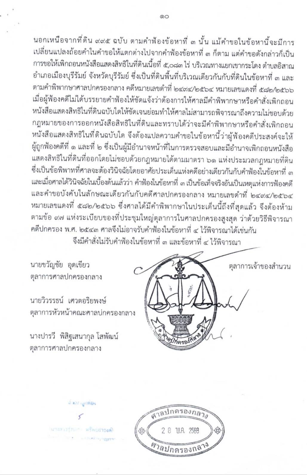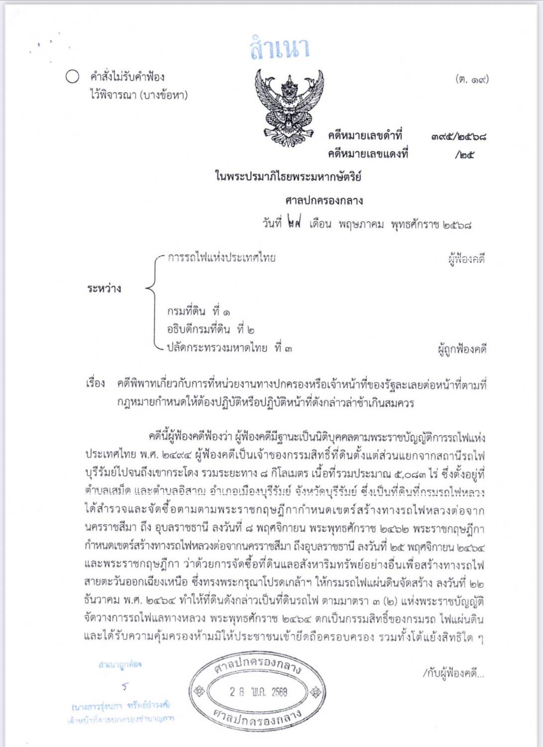13 ก.ค.2568-ผู้สื่อข่าวรายงานว่า จากกรณีที่ ศาลปกครองกลาง ได้มีคำสั่งในคดีหมายเลขดำที่ 395/2568 ลงวันที่ 27 พ.ค.2568 ซึ่งเป็นคดีที่การรถไฟแห่งประเทศไทย (รฟท.) (ผู้ฟ้องคดี) ได้ยื่นฟ้อง กรมที่ดิน กับพวกรวม 3 ราย (ผู้ถูกฟ้องคดีที่ 1-3) ในคดีพิพาทเกี่ยวกับที่ดินบริเวณแยกเขากระโดง อ.เมือง จ.บุรีรัมย์ เนื้อที่ 5,083 ไร่ ซึ่งสรุปได้เป็น 4 ข้อหา คือ