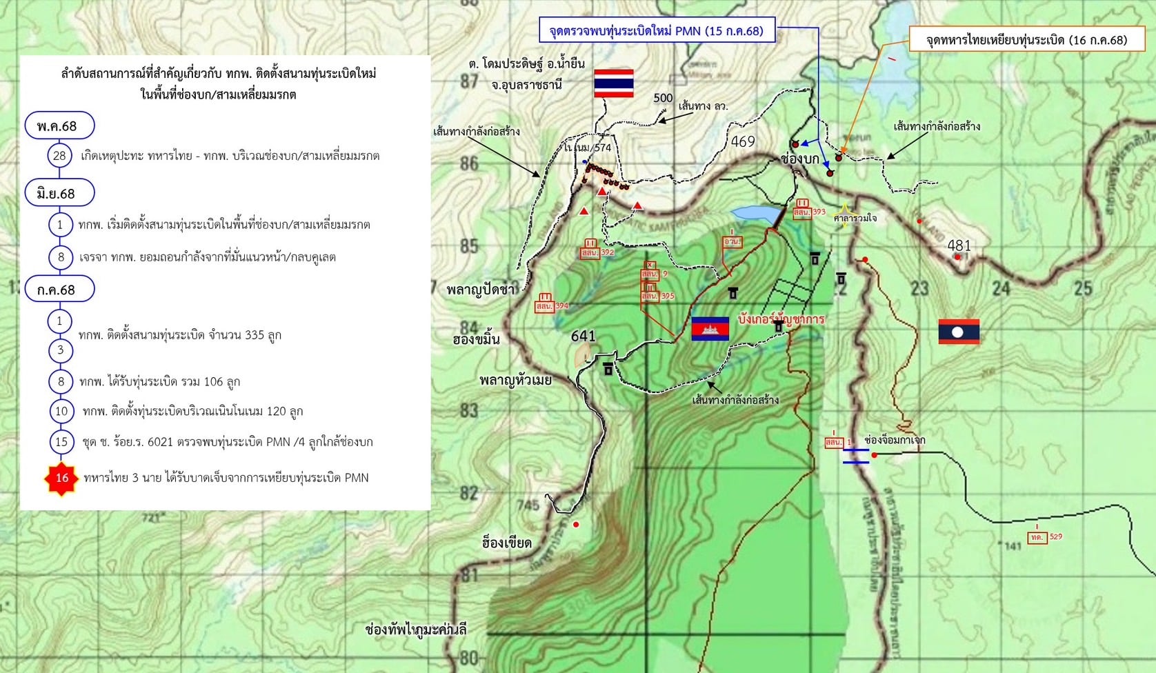 17 กรกฎาคม 2568 - มีรายงานจาก หน่วยปฏิบัติการต่อต้านทุ่นระเบิด (นปท.) จากเหตุทหารไทยเหยียบกับระเบิดในพื้นที่ช่องบกเมื่อวันที่ 16 กค.2568 นั้น มีรายงานว่า ในพื้นที่สีเขียว คือ แนวสนามทุ่นระเบิดที่ได้กวาดล้าง ทำลายหมดแล้ว โดย นปท.3 และ จากการพิสูจน์ด้วยภาพรายงาน คือ ทุ่นระเบิด PMN-2 ที่เป็นทุ่นใหม่ จึงคาดว่าจะเป็นทุ่นระเบิดที่วางใหม่