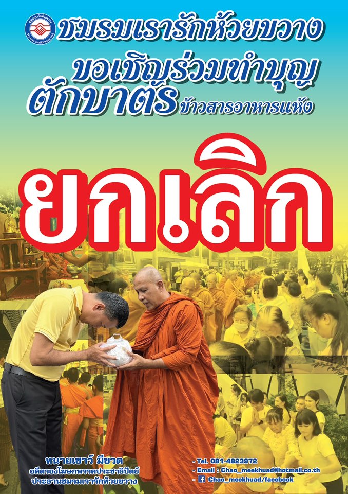 ชมรมเรารักห้วยขวาง จึงขอยกเลิกกิจกรรมทำบุญตักบาตรข้าวสาร อาหารแห้ง แต่พระสงฆ์จำนวน 99 รูป ในจันทร์ที่ 28 กรกฎาคม 2568 ตามที่ได้ประกาศไปก่อนหน้านี้ เพื่อให้หน่วยงานที่รับผิดชอบร่วมกันแก้ไขสะสางปัญหาที่เกิดขึ้นให้สำเร็จ เพื่อสร้างความเชื่อมั่นเลื่อมใสศรัทธาของพุทธศาสนิกชนที่มีต่อพระพุทธศาสนาสืบไป