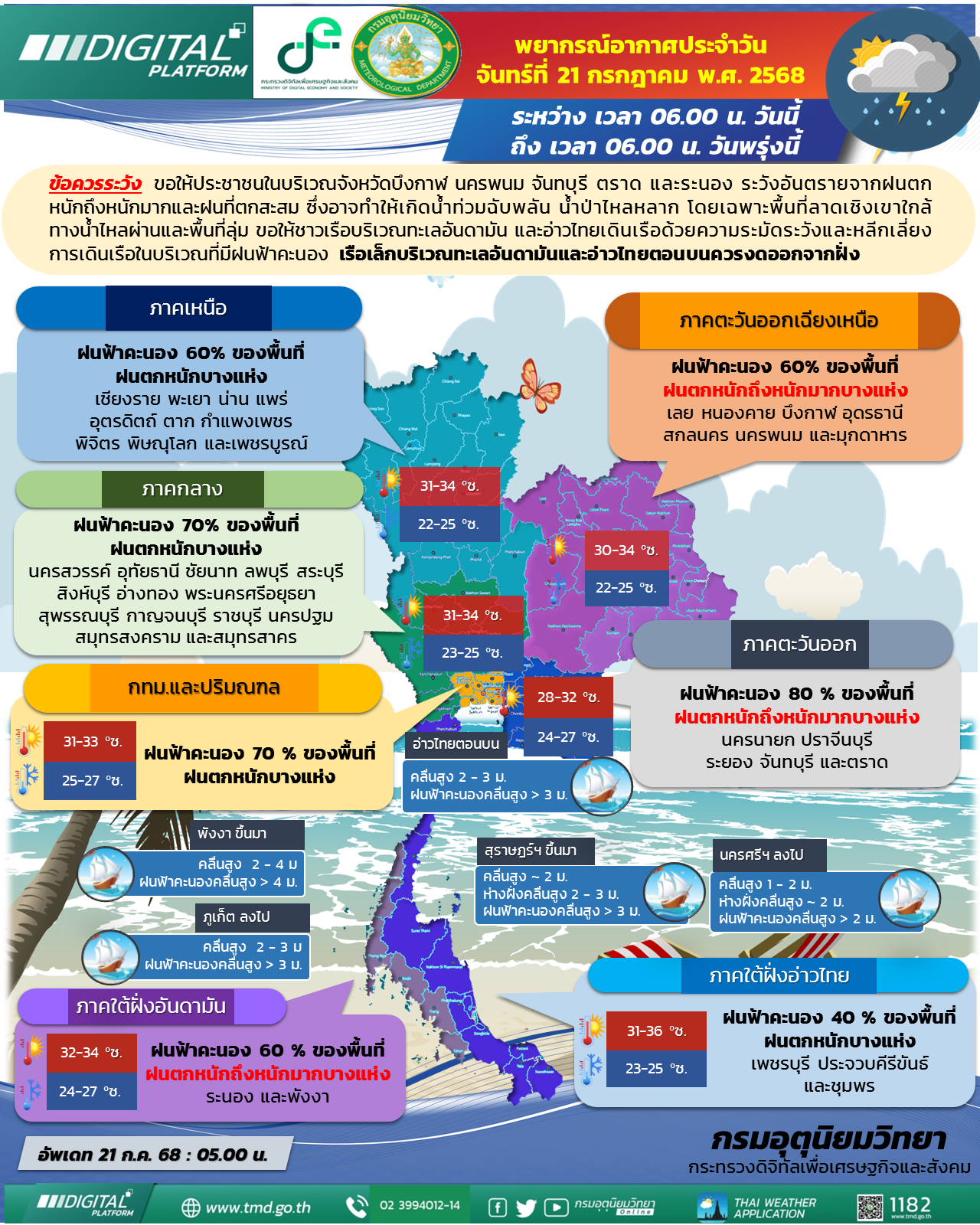 21 ก.ค. 2568 – กรมอุตุนิยมวิทยา พยากรณ์อากาศ 24 ชั่วโมงข้างหน้าว่า ประเทศไทยมีฝนตกหนักบางพื้นที่ โดยจะมีฝนตกหนักมากบางแห่งบริเวณจังหวัดบึงกาฬ นครพนม จันทบุรี ตราด และระนอง ขอให้ประชาชนในบริเวณดังกล่าวระวังอันตรายจากฝนตกหนักถึงหนักมากและฝนที่ตกสะสม ซึ่งอาจทำให้เกิดน้ำท่วมฉับพลัน น้ำป่าไหลหลาก โดยเฉพาะพื้นที่ลาดเชิงเขาใกล้ทางน้ำไหลผ่านและพื้นที่ลุ่ม ทั้งนี้เนื่องจากมรสุมตะวันตกเฉียงใต้กำลังแรงพัดปกคลุมทะเลอันดามัน ประเทศไทย และอ่าวไทย