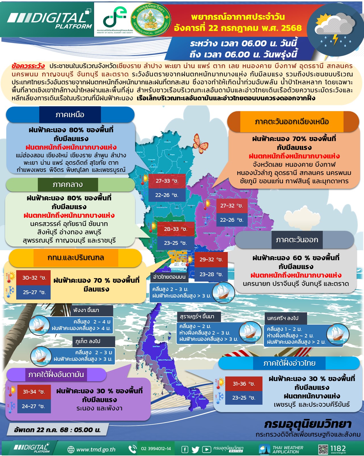 22 ก.ค. 2568- กรมอุตุนิยมวิทยาพยากรณ์อากาศ 24 ชั่วโมงข้างหน้า ประเทศไทยมีฝนตกหนักบางแห่ง กับมีลมแรง โดยมีฝนตกหนักมากบางพื้นที่บริเวณจังหวัดเชียงราย ลำปาง พะเยา น่าน แพร่ ตาก เลย หนองคาย บึงกาฬ อุดรธานี สกลนคร นครพนม กาญจนบุรี จันทบุรี และตราด ขอให้ประชาชนในบริเวณดังกล่าวระวังอันตรายจากฝนตกหนักถึงหนักมากและฝนที่ตกสะสม ซึ่งอาจทำให้เกิดน้ำท่วมฉับพลัน น้ำป่าไหลหลาก โดยเฉพาะพื้นที่ลาดเชิงเขาใกล้ทางน้ำไหลผ่านและพื้นที่ลุ่ม ทั้งนี้เนื่องจากมรสุมตะวันตกเฉียงใต้กำลังแรงพัดปกคลุมทะเลอันดามัน ประเทศไทย และอ่าวไทย ประกอบกับมีร่องมรสุมพาดผ่านประเทศเมียนมาตอนบน และประเทศลาวตอนบน ในขณะที่พายุโซนร้อนกำลังแรง “วิภา” ที่ปกคลุมบริเวณอ่าวตังเกี๋ย คาดว่าจะเคลื่อนขึ้นฝั่งบริเวณประเทศเวียดนามตอนบนในวันนี้ (22 ก.ค. 68)