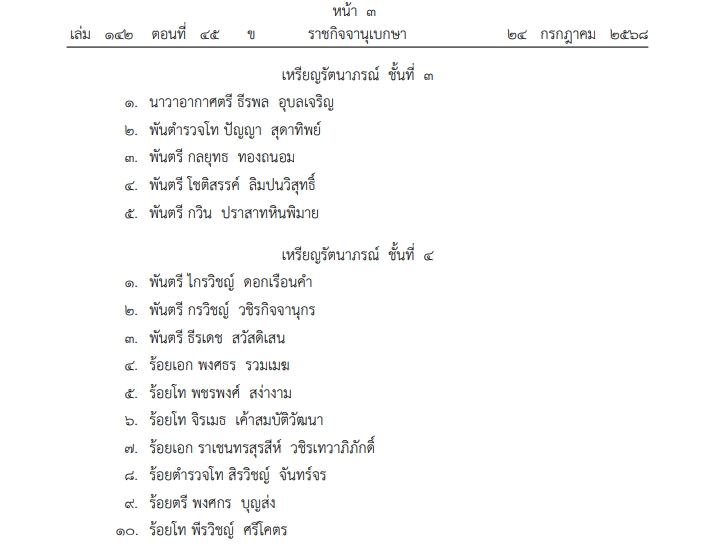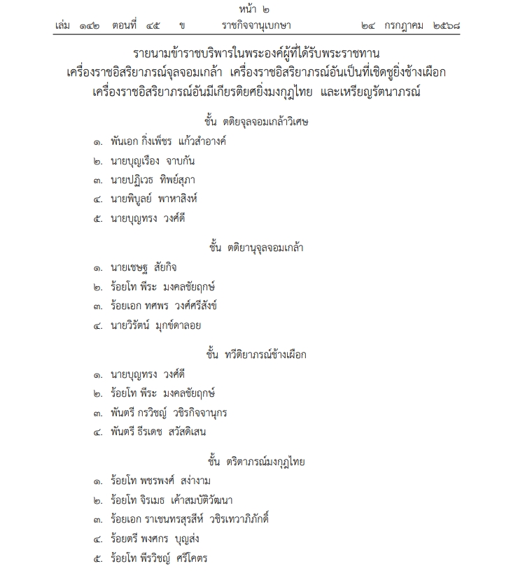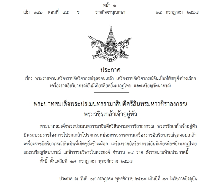 24 กรกฎาคม 2568 - เว็บไซต์ราชกิจจานุบเกษา เผยแพร่ประกาศเรื่อง พระราชทานเครื่องราชอิสริยาภรณ์จุลจอมเกล้า เครื่องราชอิสริยาภรณ์อันเป็นที่เชิดชูยิ่งช้างเผือก เครื่องราชอิสริยาภรณ์อันมีเกียรติยศยิ่งมงกุฎไทย และเหรียญรัตนาภรณ์