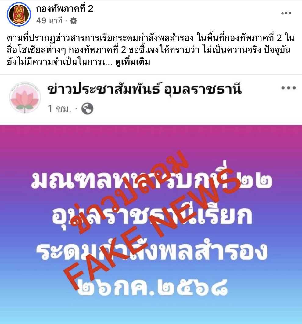 27 ก.ค. 2568 เพจกองทัพภาคที่ 2 ออกมาปฏิเสธข่าว การเรียกระดมกำลังพลสำรอง โดยระบุว่า