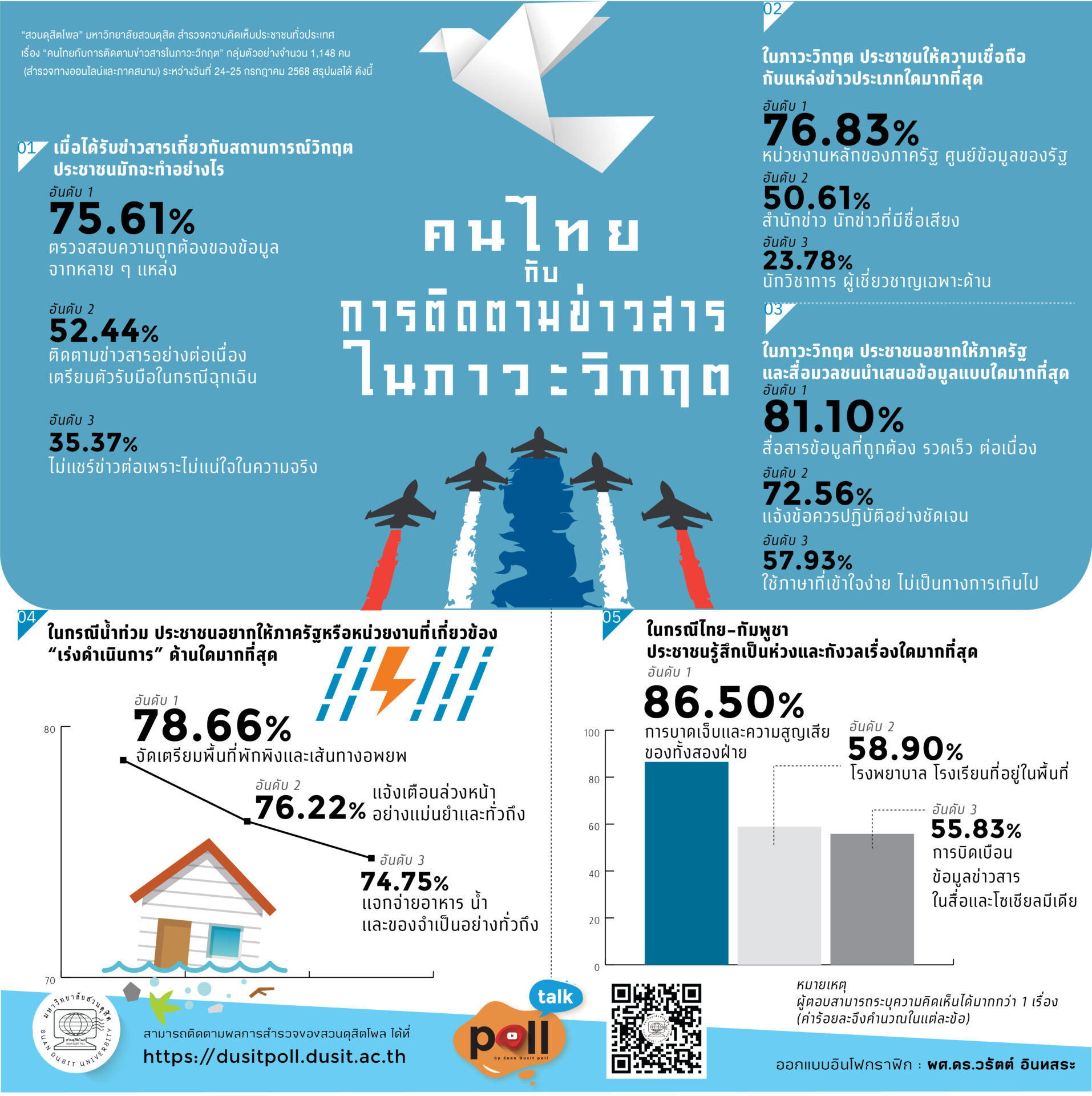 7 ก.ค. 2568 – “สวนดุสิตโพล” มหาวิทยาลัยสวนดุสิต สำรวจความคิดเห็นประชาชนทั่วประเทศ เรื่อง “คนไทยกับการติดตามข่าวสารในภาวะวิกฤต” กลุ่มตัวอย่าง จำนวน 1,148 คน (สำรวจทางออนไลน์และภาคสนาม) ระหว่างวันที่ 24-25 กรกฎาคม 2568 พบว่า เมื่อได้รับข่าวสารเกี่ยวกับสถานการณ์วิกฤตประชาชนจะตรวจสอบความถูกต้องของข้อมูลจากหลาย ๆ แหล่ง ร้อยละ 75.61 โดยจะเชื่อถือแหล่งข่าวจากหน่วยงานหลักของภาครัฐ ศูนย์ข้อมูลของรัฐมากที่สุด ร้อยละ 76.83 ทั้งนี้อยากให้ภาครัฐและสื่อมวลชนนำเสนอข้อมูลที่ถูกต้อง รวดเร็ว และต่อเนื่อง ร้อยละ 81.10 กรณีน้ำท่วมอยากให้เร่งดำเนินการจัดเตรียมพื้นที่พักพิงและเส้นทางอพยพ ร้อยละ 78.66 ด้านกรณีไทย-กัมพูชาประชาชนรู้สึกเป็นห่วงและกังวลเรื่องการบาดเจ็บและความสูญเสียของทั้งสองฝ่าย ร้อยละ 86.50