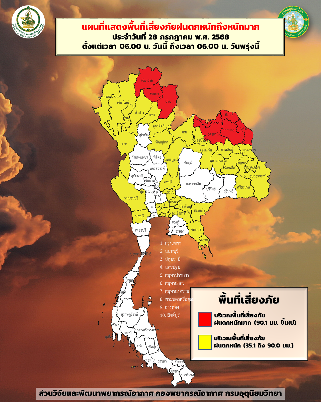 28 ก.ค. 2568 – กรมอุตุนิยมวิทยา พยากรณ์อากาศ 24 ชั่วโมงข้างหน้าว่า ประเทศไทยตอนบนยังคงมีฝนตกหนักบางแห่ง และมีฝนตกหนักมากบางพื้นที่ในภาคเหนือและภาคตะวันออกเฉียงเหนือ โดยเฉพาะบริเวณจังหวัดเชียงราย พะเยา น่าน หนองคาย บึงกาฬ อุดรธานี สกลนคร และนครพนม ขอให้ประชาชนในบริเวณดังกล่าวระวังอันตรายจากฝนตกหนักถึงหนักมากและฝนที่ตกสะสมซึ่งอาจทำให้เกิดน้ำท่วมฉับพลัน น้ำป่าไหลหลาก และน้ำล้นตลิ่ง โดยเฉพาะพื้นที่ลาดเชิงเขาใกล้ทางน้ำไหลผ่านและพื้นที่ลุ่ม ทั้งนี้เนื่องจากร่องมรสุมพาดผ่านตอนบนของภาคเหนือ และประเทศลาวตอนบน เข้าสู่หย่อมความกดอากาศต่ำบริเวณประเทศเวียดนามตอนบน ประกอบกับมรสุมตะวันตกเฉียงใต้กำลังปานกลางพัดปกคลุมทะเลอันดามัน ประเทศไทย และอ่าวไทย