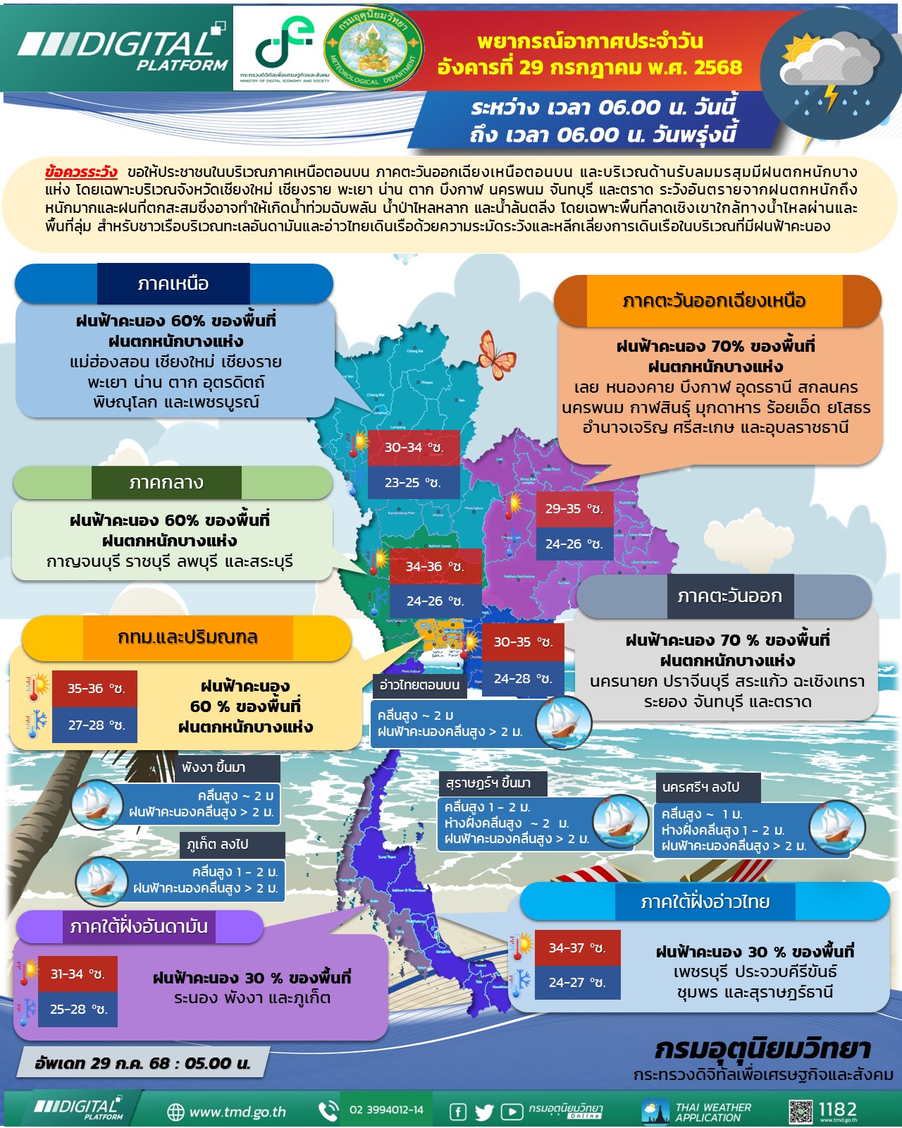 29 ก.ค. 2568- กรมอุตุนิยมวิทยาพยากรณ์อากาศ 24 ชั่วโมงข้างหน้า ภาคเหนือตอนบน ภาคตะวันออกเฉียงเหนือตอนบน และบริเวณด้านรับลมมรสุมมีฝนตกหนักบางแห่ง โดยเฉพาะบริเวณจังหวัดเชียงใหม่ เชียงราย พะเยา น่าน ตาก บึงกาฬ นครพนม จันทบุรี และตราด ขอให้ประชาชนในบริเวณดังกล่าวระวังอันตรายจากฝนตกหนักและฝนที่ตกสะสมซึ่งอาจทำให้เกิดน้ำท่วมฉับพลัน น้ำป่าไหลหลาก และน้ำล้นตลิ่ง โดยเฉพาะพื้นที่ลาดเชิงเขาใกล้ทางน้ำไหลผ่านและพื้นที่ลุ่ม ทั้งนี้เนื่องจากร่องมรสุมพาดผ่านประเทศเมียนมา และประเทศลาวตอนบน เข้าสู่หย่อมความกดอากาศต่ำบริเวณประเทศเวียดนามตอนบน ประกอบกับมรสุมตะวันตกเฉียงใต้กำลังปานกลางพัดปกคลุมทะเลอันดามัน ประเทศไทย และอ่าวไทย