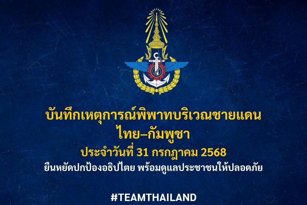 1 ส.ค. 2568 – กองบัญชาการกองทัพไทย บันทึกเหตุการณ์พิพาทบริเวณชายแดนไทย–กัมพูชา วันที่ 31 กรกฎาคม 2568 ตามรายงานจากศูนย์ปฏิบัติการกองทัพภาคที่ 2 ได้สรุปเหตุการณ์บริเวณชายแดนไทย–กัมพูชา ดังนี้