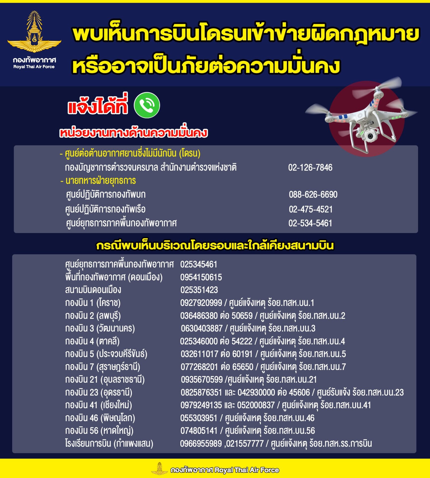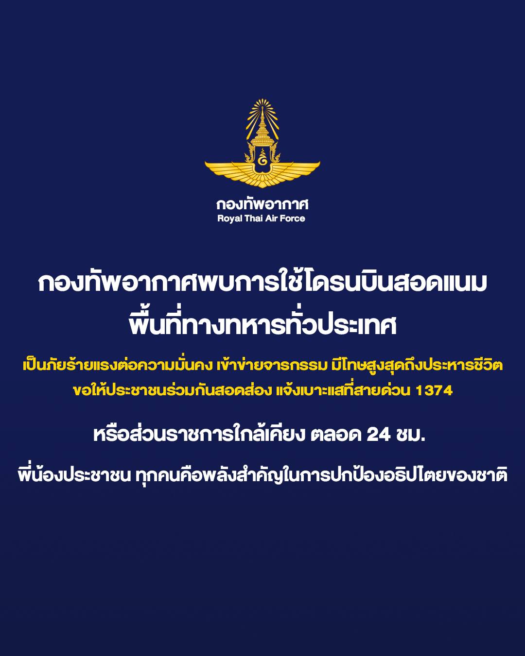 ปัจจุบัน สถานการณ์ความขัดแย้งระหว่างไทย กัมพูชา ยังคงต้องเฝ้าระวัง โดรนคือภัยคุกคามที่ร้ายแรงและส่งผลกระทบต่อความมั่นคงและชีวิตประชาชน กองทัพอากาศจึงขอความร่วมมือประชาชนทุกท่านที่พบเห็นหรือทราบเบาะแสเกี่ยวกับการบินของโดรน รวมทั้งผู้ที่บังคับโดรน ที่อาจฝ่าฝืนกฎหมายได้แจ้งสายด่วนความมั่นคง 1374 หรือหน่วยงานราชการใกล้เคียง ได้ตลอด 24 ชั่วโมง
