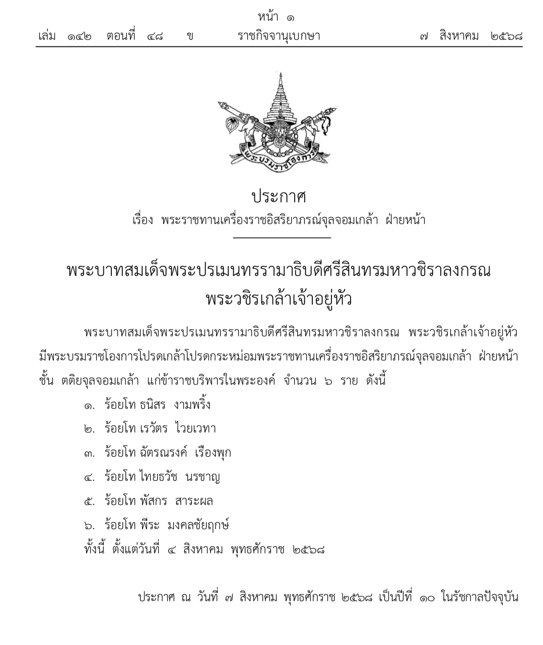 8 สิงหาคม 2568 - เว็บไซต์ราชกิจจานุเบกษา เผยแพร่ประกาศ เรื่อง พระราชทานเครื่องราชอิสริยากรณ์จุลจอมเกล้า ฝ่ายหน้า