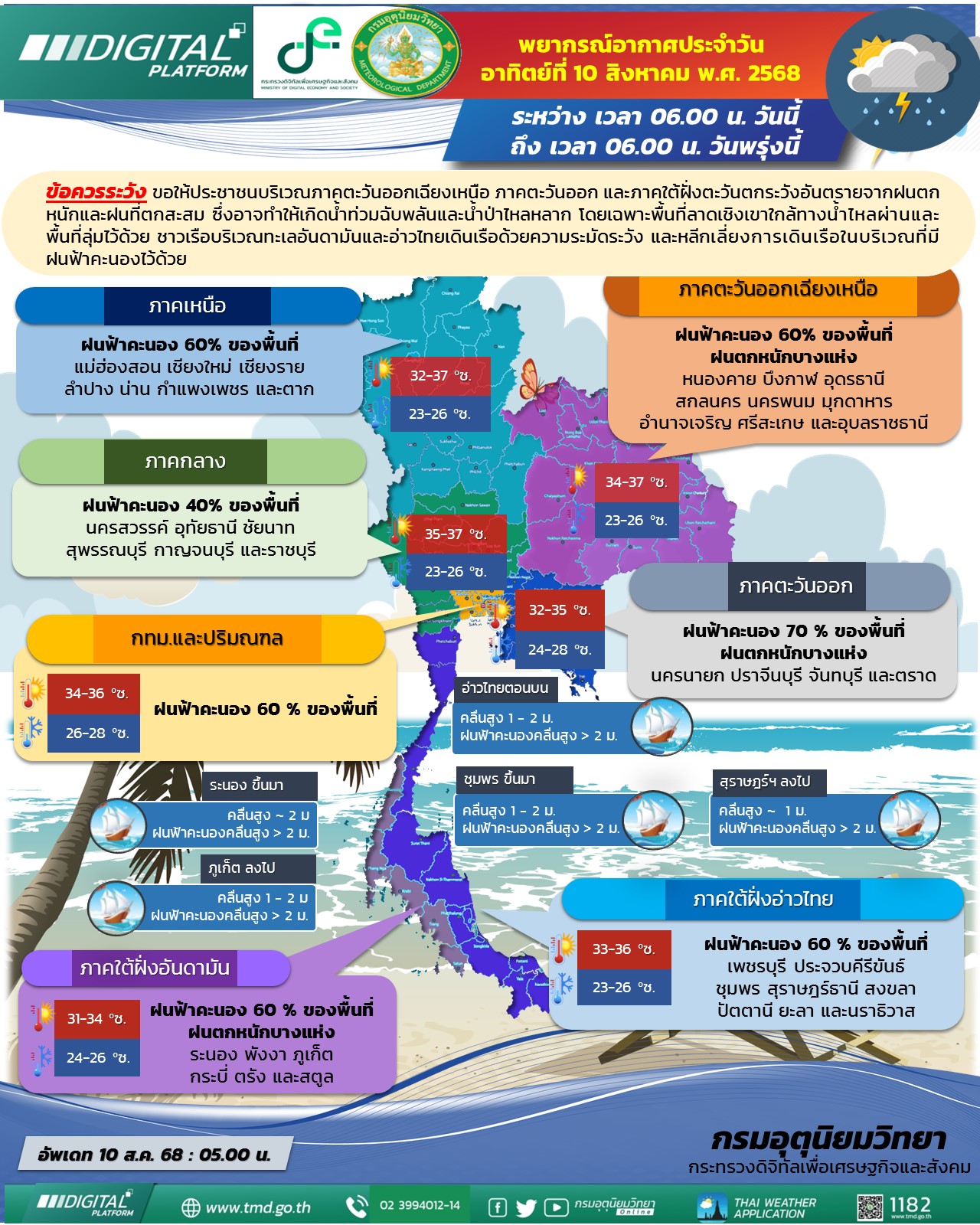 10 ส.ค. 2568 – พยากรณ์อากาศ 24 ชั่วโมงข้างหน้า ประเทศไทยจะมีฝนเพิ่มขึ้น และมีฝนตกหนักบางแห่งบริเวณภาคตะวันออกเฉียงเหนือ ภาคตะวันออก และภาคใต้ฝั่งตะวันตก ขอให้ประชาชนบริเวณดังกล่าวระวังอันตรายจากฝนตกหนักและฝนที่ตกสะสม ซึ่งอาจทำให้เกิดน้ำท่วมฉับพลันและน้ำป่าไหลหลาก โดยเฉพาะพื้นที่ลาดเชิงเขาใกล้ทางน้ำไหลผ่านและพื้นที่ลุ่มไว้ด้วย เนื่องจากมีหย่อมความกดอากาศต่ำบริเวณประเทศลาวตอนบนและประเทศเวียดนามตอนบน ประกอบกับมรสุมตะวันตกเฉียงใต้ที่พัดปกคลุมทะเลอันดามัน ประเทศไทย และอ่าวไทยจะมีกำลังแรงขึ้น