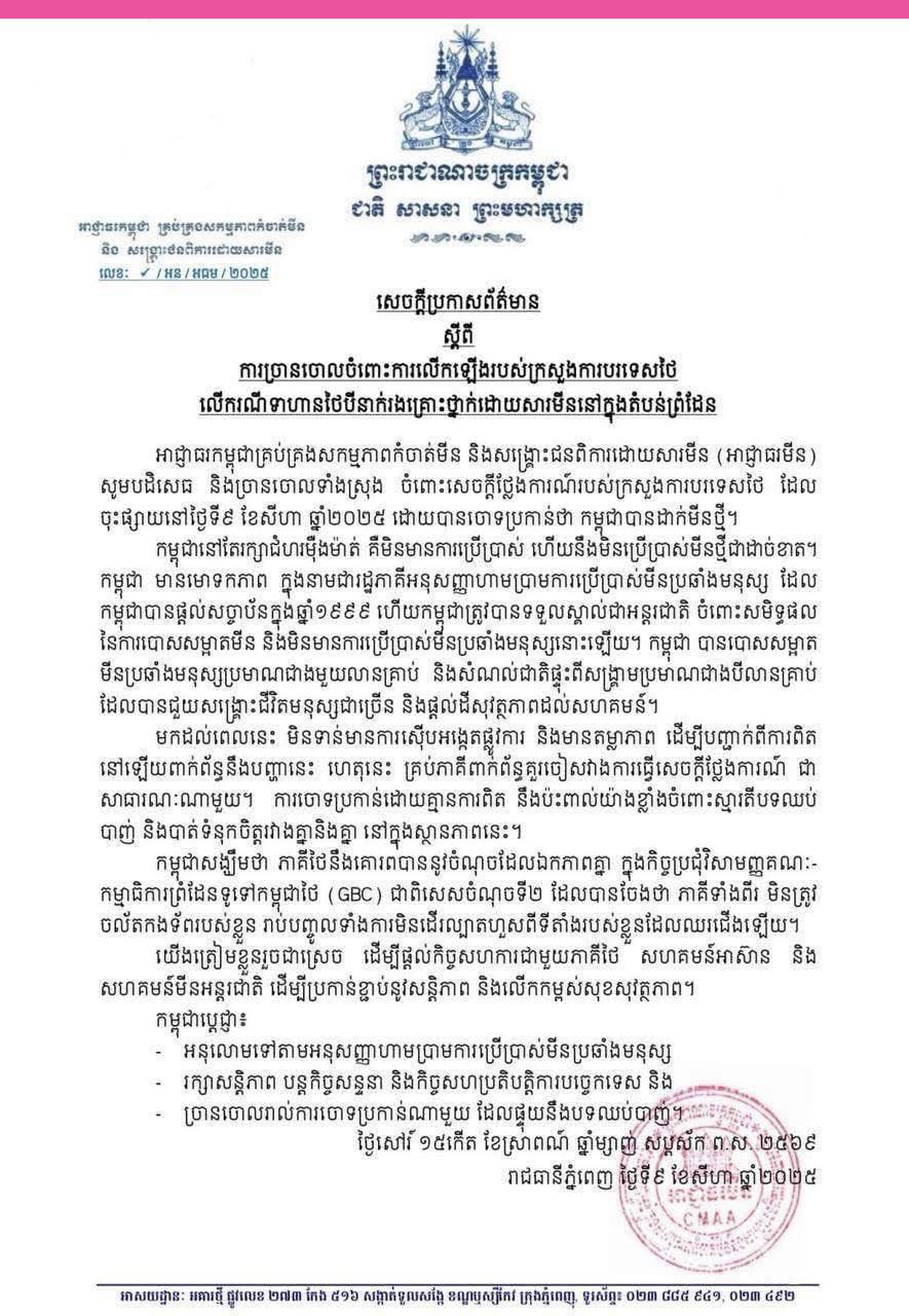 10 ส.ค. 2568 – หน่วยงานจัดการทุ่นระเบิดและช่วยเหลือผู้พิการจากทุ่นระเบิดของกัมพูชา (หน่วยงานทุ่นระเบิด) ออกแถลงการณ์ปฏิเสธ ต่อแถลงการณ์ของกระทรวงการต่างประเทศไทย ที่เผยแพร่เมื่อวันที่ 9 สิงหาคม 2568 ซึ่งกล่าวหาว่ากัมพูชาวางทุ่นระเบิดใหม่