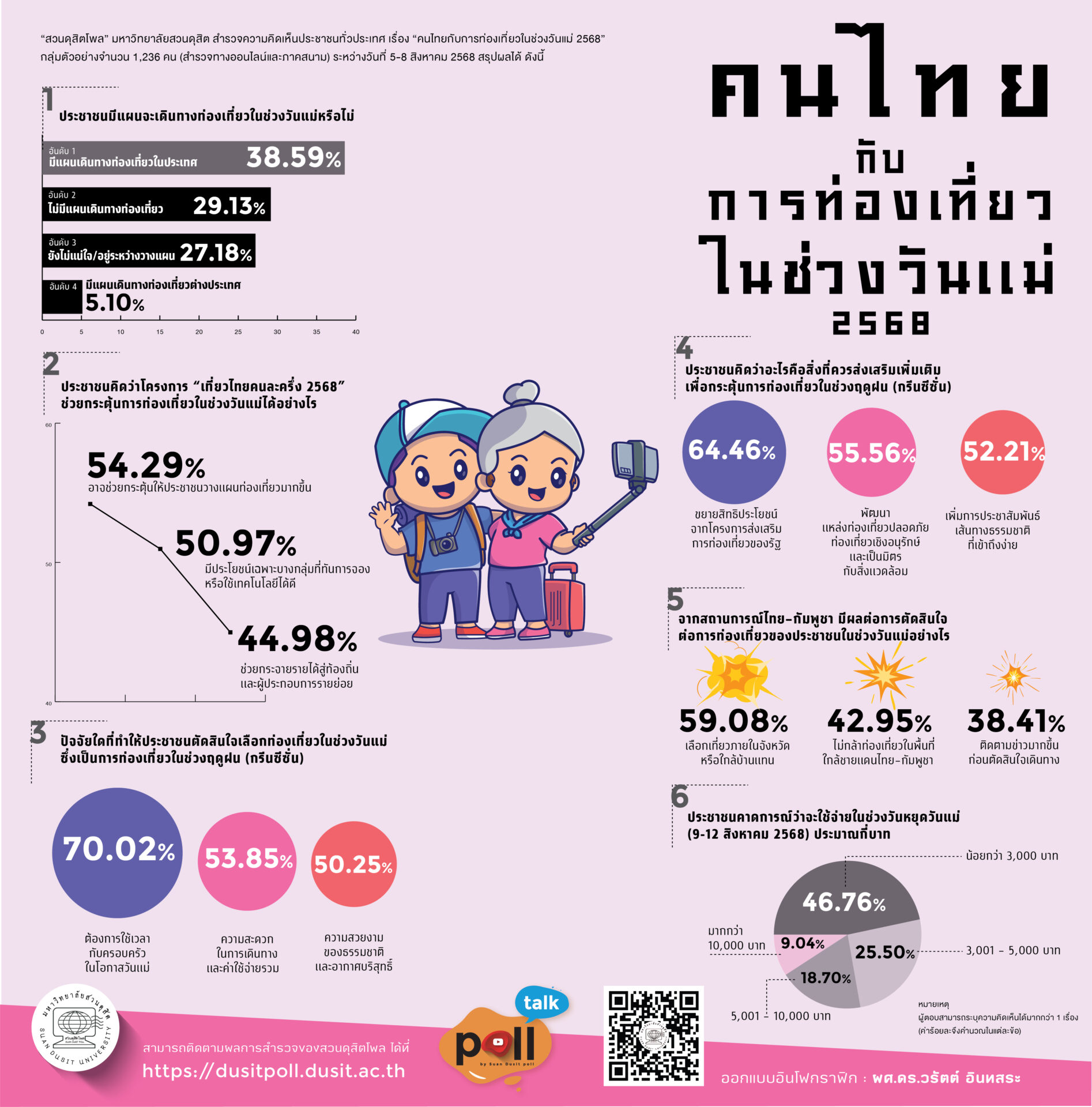 10 ส.ค. 2568 – “สวนดุสิตโพล” มหาวิทยาลัยสวนดุสิต สำรวจความคิดเห็นประชาชนทั่วประเทศ เรื่อง “คนไทยกับการท่องเที่ยวในช่วงวันแม่ 2568” กลุ่มตัวอย่าง จำนวน 1,236 คน (สำรวจทางออนไลน์และภาคสนาม) ระหว่างวันที่ 5-8 สิงหาคม 2568 พบว่า ในช่วงวันแม่ที่มีวันหยุดยาว กลุ่มตัวอย่าง ร้อยละ 38.59 มีแผนเดินทางท่องเที่ยวในประเทศ ทั้งนี้เห็นว่าโครงการ “เที่ยวไทยคนละครึ่ง 2568” อาจช่วยกระตุ้นให้ประชาชนวางแผนท่องเที่ยวมากขึ้น ร้อยละ 54.29 โดยเหตุผลที่เลือกท่องเที่ยวในช่วงฤดูฝน (กรีนซีซั่น) คือ ต้องการใช้เวลากับครอบครัวในโอกาสวันแม่ ร้อยละ 70.02 สิ่งที่ควรส่งเสริมเพิ่มเติมคือขยายสิทธิประโยชน์จากโครงการส่งเสริมการท่องเที่ยวของรัฐ ร้อยละ 64.46 ทั้งนี้สถานการณ์ไทย–กัมพูชา มีผลต่อการตัดสินใจทำให้เลือกเที่ยวภายในจังหวัดหรือใกล้บ้านแทน ร้อยละ 59.08 และคาดว่าจะใช้จ่ายในช่วงวันหยุดวันแม่ ไม่เกิน 5,000 บาท ร้อยละ 72.26