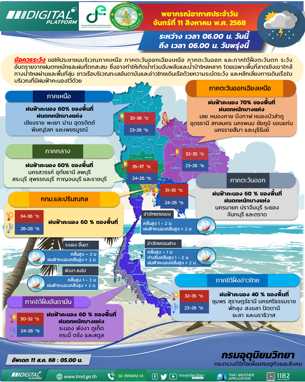 11 ส.ค. 2568 – กรมอุตุนิยมวิทยา พยากรณ์อากาศ 24 ชั่วโมงข้างหน้าว่า ภาคเหนือ ภาคตะวันออกเฉียงเหนือ ภาคตะวันออก และภาคใต้ฝั่งตะวันตก มีฝนตกหนักบางแห่ง ขอให้ประชาชนในบริเวณดังกล่าวระวังอันตรายจากฝนตกหนักและฝนที่ตกสะสม ซึ่งอาจทำให้เกิดน้ำท่วมฉับพลันและน้ำป่าไหลหลาก โดยเฉพาะพื้นที่ลาดเชิงเขาใกล้ทางน้ำไหลผ่านและพื้นที่ลุ่มไว้ด้วย เนื่องจากมีร่องมรสุมพาดผ่านประเทศลาวตอนบน และประเทศเวียดนามตอนบน ประกอบกับมรสุมตะวันตกเฉียงใต้ที่พัดปกคลุมทะเลอันดามัน ประเทศไทย และอ่าวไทยมีกำลังแรงขึ้น