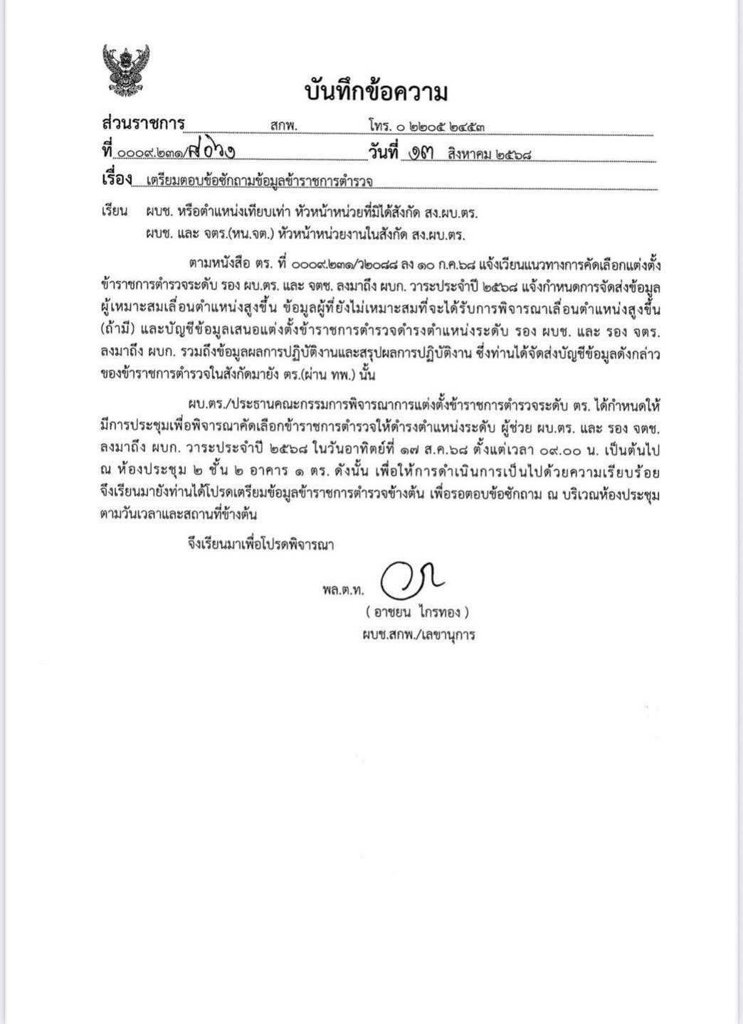 ผบ.ตร./ประธานคณะกรรมการพิจารณาการแต่งตั้งข้าราชการตำรวจระดับ ตร. ได้กำหนดให้มีการประชุมเพื่อพิจารณาคัดเลือกข้าราชการตำรวจให้ดำรงตำแหน่งระดับ ผู้ช่วย ผบ.ตร. และ รอง จตช.ลงมาถึง ผบก. วาระประจำปี 2568 ในวันอาทิตย์ที่ 17 ส.ค.68 ตั้งแต่เวลา 09.00 น. เป็นต้นต้นไป ที่ห้องประชุม 2 ชั้น 2 อาคาร 1 ตร. ดังนั้น เพื่อให้การดำเนินการเป็นไปด้วยความเรียบร้อย จึงเรียนมายังท่านได้โปรดเตรียมข้อมูลข้าราชการตำรวจข้างต้น เพื่อรอตอบข้อชักถาม ณ บริเวณห้องประชุมตามวันเวลาและสถานที่ข้างต้น จึงเรียนมาเพื่อโปรดพิจารณา