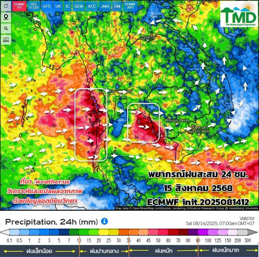 15 ส.ค. 2568 – กรมอุตุนิยมวิทยาอัปเดตผลการพยากรณ์ฝนสะสมรายวัน (ทุกๆ 24 ชม. : (นับตั้งแต่ 07.00 น. ถึง 07.00 น.วันรุ่งขึ้น) และลมที่ระดับ 925hPa (750 ม.) 15 วันล่วงหน้า ระหว่าง 15 – 29 ส.ค. 68 init. 2025081412 จากศูนย์พยากรณ์อากาศระยะกลางยุโรป (ECMWF) วิเคราะห์ตามผลจากแบบจำลองฯ เฉดสีแดงหมายถึงฝนหนัก สีเขียวหมายถึงฝนเล็กน้อย :