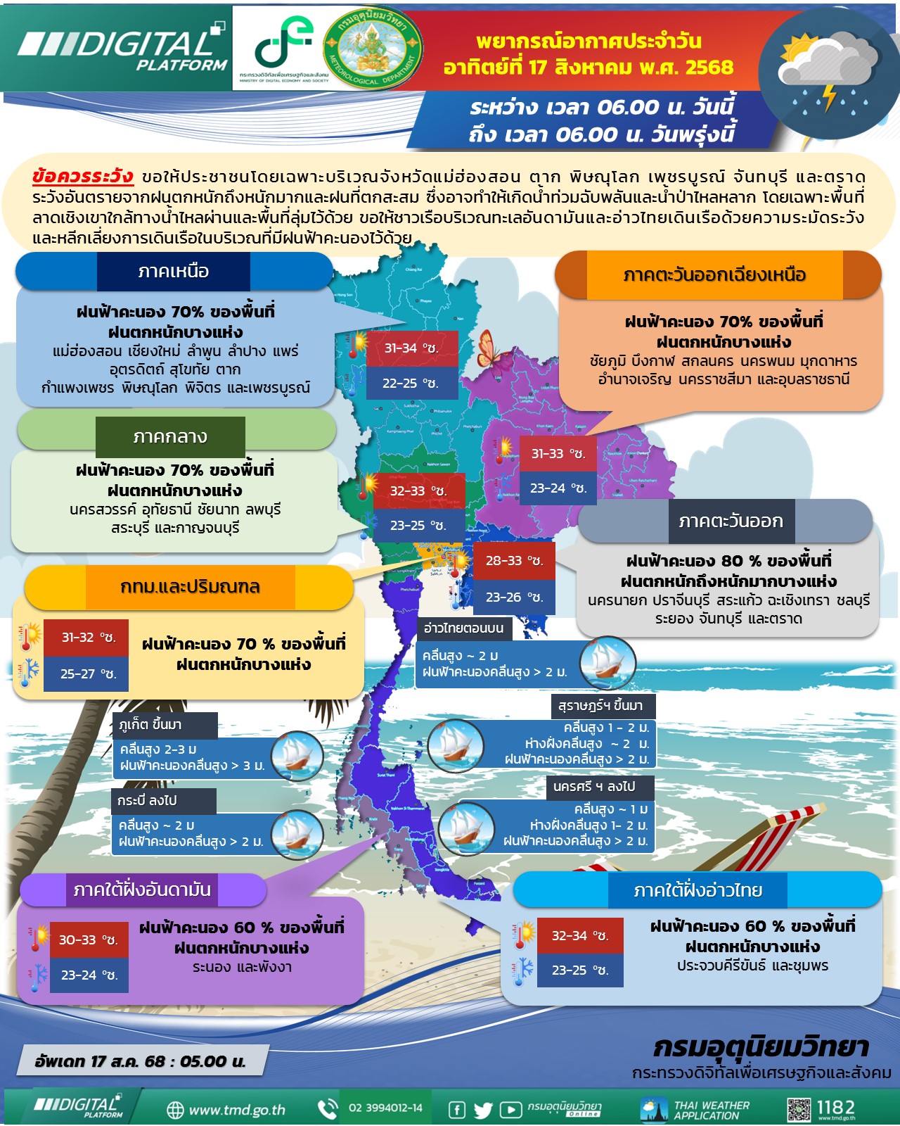 17 ส.ค. 2568 กรมอุตุนิยมวิทยา พยากรณ์อากาศ 24 ชั่วโมงข้างหน้า ประเทศไทยมีฝนอยู่ในเกณฑ์กระจายถึงเกือบทั่วไปและมีฝนตกหนักบางแห่ง โดยมีฝนตกหนักมากบางพื้นที่ในภาคตะวันออก ขอให้ประชาชนโดยเฉพาะบริเวณจังหวัด แม่ฮ่องสอน ตาก พิษณุโลก เพชรบูรณ์ จันทบุรี และตราด ระวังอันตรายจากฝนตกหนักถึงหนักมากและฝนที่ตกสะสม ซึ่งอาจทำให้เกิดน้ำท่วมฉับพลันและน้ำป่าไหลหลาก โดยเฉพาะพื้นที่ลาดเชิงเขาใกล้ทางน้ำไหลผ่านและพื้นที่ลุ่ม เนื่องจากร่องมรสุมพาดผ่านภาคเหนือตอนล่าง และภาคตะวันออกเฉียงเหนือเข้าสู่หย่อมความกดอากาศต่ำกำลังแรงบริเวณทะเลจีนใต้ตอนบน ประกอบกับมรสุมตะวันตกเฉียงใต้กำลังค่อนข้างแรงพัดปกคลุมทะเลอันดามัน ประเทศไทย และอ่าวไทย