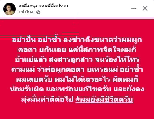 “สงสารลูกสาว จนร้องไห้โทรถามแม่ ว่าพ่อผูกคอตา ยเหรอแม่ อย่าซ้ำผมเลยครับ ผมไม่ได้เลวอะไร ผิดผมก็น้อมรับผิด และพร้อมแก้ไขครับ และยังคงมุ่งมั่นทำดีต่อไป #ผมยังมีชีวิตครับ”