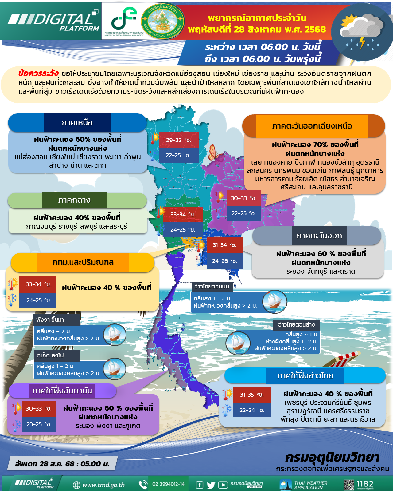 28 ส.ค.2568 - กรมอุตุนิยมวิทยาได้พยากรณ์อากาศ 24 ชั่วโมงข้างหน้า ว่าประเทศไทยยังคงมีฝนฟ้าคะนอง และมีฝนตกหนักบางแห่ง ขอให้ประชาชนโดยเฉพาะบริเวณจังหวัดแม่ฮ่องสอน เชียงใหม่ เชียงราย และน่าน ระวังอันตรายจากฝนตกหนัก และฝนที่ตกสะสม ซึ่งอาจทำให้เกิดน้ำท่วมฉับพลัน และน้ำป่าไหลหลาก โดยเฉพาะพื้นที่ลาดเชิงเขาใกล้ทางน้ำไหลผ่านและพื้นที่ลุ่ม เนื่องจากร่องมรสุมพาดผ่านประเทศเมียนมา ตอนบนของภาคเหนือ เข้าสู่หย่อมความกดอากาศต่ำบริเวณประเทศลาว และเวียดนามตอนบน ประกอบกับมรสุมตะวันตกเฉียงใต้กำลังปานกลางพัดปกคลุมทะเลอันดามัน ประเทศไทย และอ่าวไทย