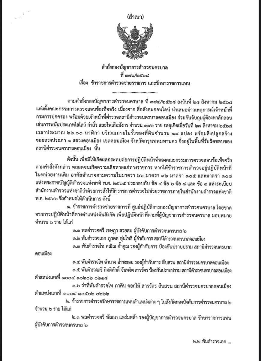 29 สิงหาคม 2568 - พล.ต.ท.สยาม บุญสม ผบช.น.ลงนามคำสั่งที่ 376/2568 เรื่อง ข้าราชการตำรวจช่วยราชการ และรักษาราชการแทน คำสั่งระบุว่า ตามคำสั่งกองบัญชาการตำรตำรวจนครบาล ที่ 374/2568 ลงวันที่ 28 สิงหาคม 2568 แต่งตั้งคณะกรรมการตรวจสอบข้อเท็จจริง เนื่องจากสื่อสังคมออนไลน์นำเสนอข่าวเหตุการณ์ กรมการปกครองพร้อมด้วยเจ้าหน้าที่ตำรวจสถานีตำรวจนครบาลดอนเมือง ร่วมกันกันจับกุมผู้ต้องหาลักลอบเล่นการพนันประเภทไฮโล กำถั่ว และไพ่เสือมังกร จำนวน 176 ราย เหตุเกิดเมื่อวันที่ 27 สิ่งหาคม 2568 เวลาประมาณ 22.00 น. บริเวณภายในรั้วของที่ดินจำนวน 18 แปลง พร้อมสิ่งปลูกสร้างชอยสรงประภา แขวงตอนเมือง เขตตอนเมือง จังหวัดกรุงเทพมหานคร ซึ่งอยู่ในพื้นที่รับผิดชอบของสถานีตำรวจนครบาลดอนเมือง นั้น
