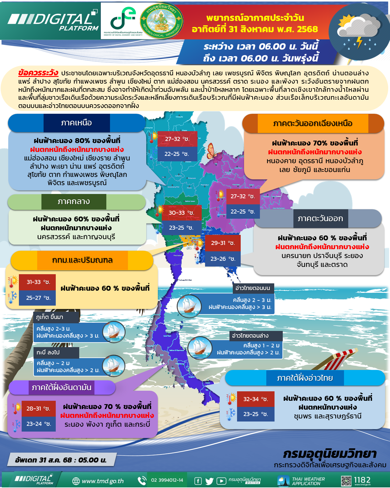 31 สิงหาคม 2568 กรมอุตุนิยมวิทยา รายงานลักษณะอากาศทั่วไป พยากรณ์อากาศ 24 ชั่วโมงข้างหน้า ประเทศไทยมีฝนตกหนักบางแห่ง โดยมีฝนตกหนักมากบางพื้นที่ กับมีลมแรง ในภาคเหนือ ภาคตะวันออกเฉียงเหนือ ภาคตะวันออก และภาคใต้ฝั่งตะวันตก ขอให้ประชาชนโดยเฉพาะบริเวณจังหวัดอุดรธานี หนองบัวลำภู เลย เพชรบูรณ์ พิจิตร พิษณุโลก อุตรดิตถ์ น่านตอนล่าง แพร่ ลำปาง สุโขทัย กำแพงเพชร ลำพูน เชียงใหม่ ตาก แม่ฮ่องสอน นครสวรรค์ ตราด ระนอง และพังงา ระวังอันตรายจากฝนตกหนักถึงหนักมากและฝนที่ตกสะสม ซึ่งอาจทำให้เกิดน้ำท่วมฉับพลันและน้ำป่าไหลหลาก โดยเฉพาะพื้นที่ลาดเชิงเขาใกล้ทางน้ำไหลผ่านและพื้นที่ลุ่ม เนื่องจากร่องมรสุมพาดผ่านภาคเหนือ และภาคตะวันออกเฉียงเหนือตอนบน ประกอบกับมรสุมตะวันตกเฉียงใต้ที่พัดปกคลุมทะเลอันดามัน ประเทศไทย และอ่าวไทยมีกำลังแรงขึ้น ในขณะที่มีหย่อมความกดอากาศต่ำกำลังแรงบริเวณภาคตะวันออกเฉียงเหนือตอนบน