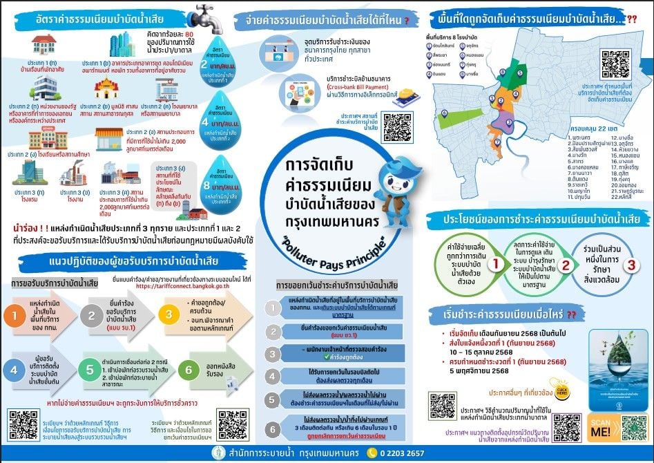 ประชาชนสามารถตรวจสอบอัตราค่าธรรมเนียม ช่องทางการชำระเงิน และรายละเอียดเพิ่มเติมได้ที่ https://tariffcenter.bangkok.go.th สอบถามเพิ่มเติมได้ที่ สำนักงานจัดการคุณภาพน้ำ สำนักการระบายน้ำ โทร. 0 2203 2657.