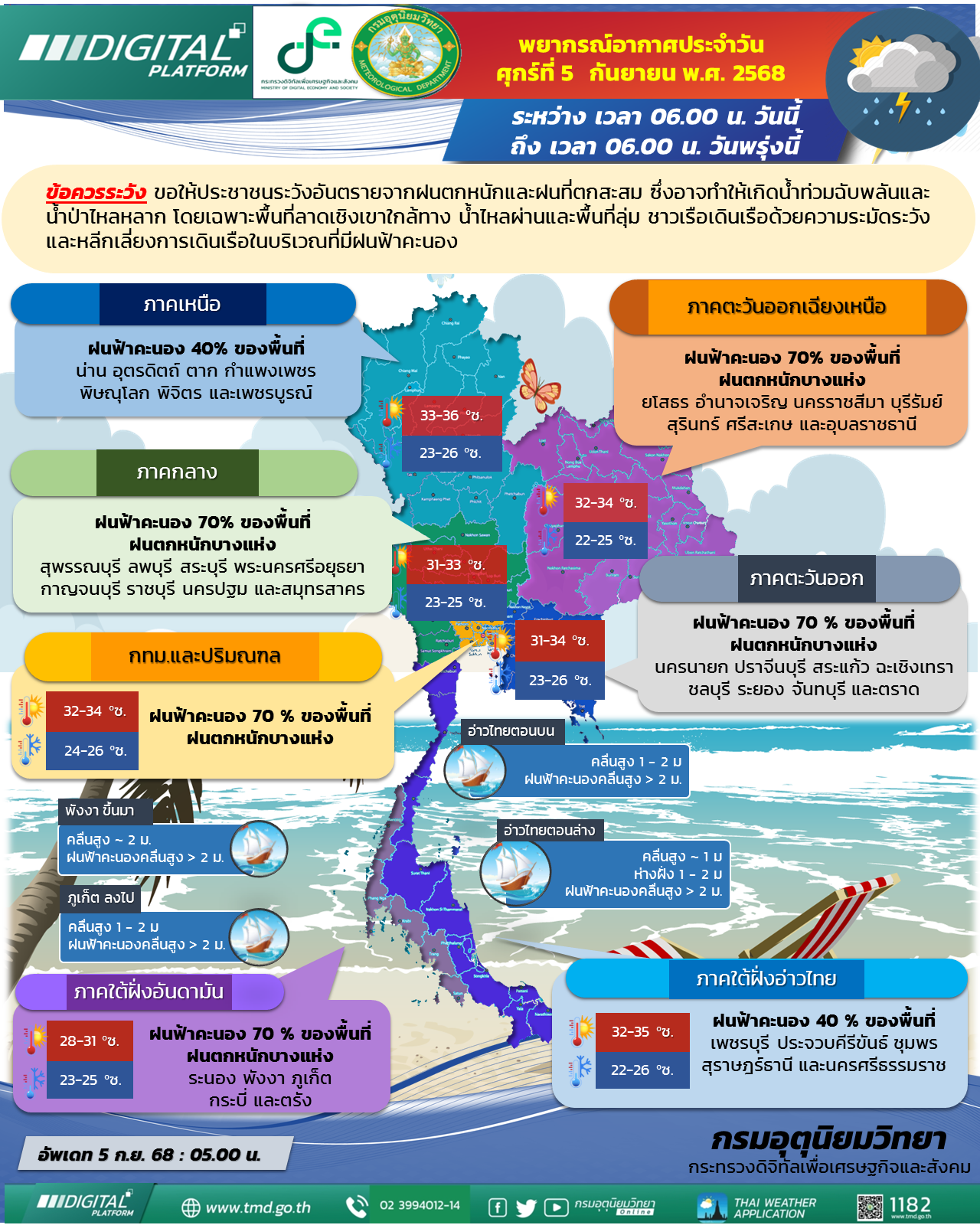 5 ก.ย. 2568 – กรมอุตุนิยมวิทยา พยากรณ์อากาศ 24 ชั่วโมงข้างหน้าว่า ภาคตะวันออกเฉียงเหนือ ภาคกลาง รวมทั้งกรุงเทพมหานครและปริมณฑล ภาคตะวันออก และภาคใต้ยังคงมีฝนตกหนักบางแห่ง ขอให้ประชาชนในบริเวณดังกล่าวระวังอันตรายจากฝนตกหนักและฝนที่ตกสะสม ซึ่งอาจทำให้เกิดน้ำท่วมฉับพลันและน้ำป่าไหลหลาก โดยเฉพาะพื้นที่ลาดเชิงเขาใกล้ทางน้ำไหลผ่านและพื้นที่ลุ่ม เนื่องจากร่องมรสุมพาดผ่านภาคเหนือตอนล่าง ภาคกลางตอนบน และภาคตะวันออกเฉียงเหนือตอนล่าง ประกอบกับมรสุมตะวันตกเฉียงใต้กำลังปานกลางยังคงพัดปกคลุมทะเลอันดามัน ภาคใต้ และอ่าวไทย