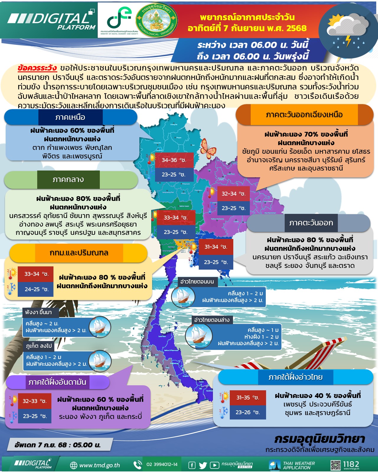 7 กันยายน 2568 กรมอุตุนิยมวิทยา รายงานพยากรณ์อากาศ 24 ชั่วโมงข้างหน้า ประเทศไทยมีฝนตกหนักบางแห่ง และมีฝนตกหนักมากบางพื้นที่ในกรุงเทพมหานครและปริมณฑล และภาคตะวันออก บริเวณจังหวัดนครนายก ปราจีนบุรี และตราด ขอให้ประชาชนในบริเวณดังกล่าวระวังอันตรายจากฝนตกหนักถึงหนักมากและฝนที่ตกสะสม ซึ่งอาจทำให้เกิดน้ำท่วมขัง น้ำรอการระบายโดยเฉพาะบริเวณชุมชนเมือง เช่น กรุงเทพมหานครและปริมณฑล รวมทั้งระวังน้ำท่วมฉับพลันและน้ำป่าไหลหลาก โดยเฉพาะพื้นที่ลาดเชิงเขาใกล้ทางน้ำไหลผ่านและพื้นที่ลุ่ม เนื่องจากร่องมรสุมพาดผ่านภาคเหนือตอนล่าง ภาคกลาง และภาคตะวันออกเฉียงเหนือตอนล่าง ประกอบกับมรสุมตะวันตกเฉียงใต้กำลังปานกลางยังคงพัดปกคลุมทะเลอันดามัน ภาคใต้ และอ่าวไทย